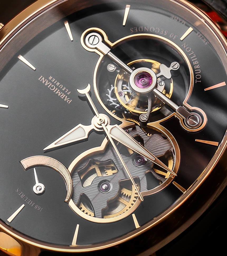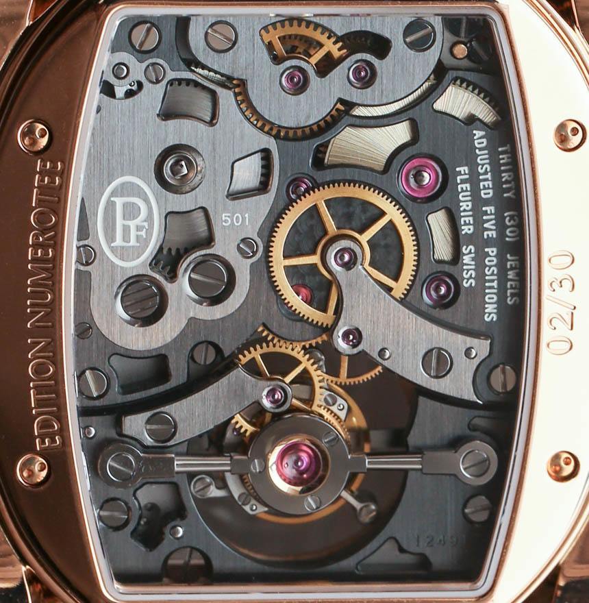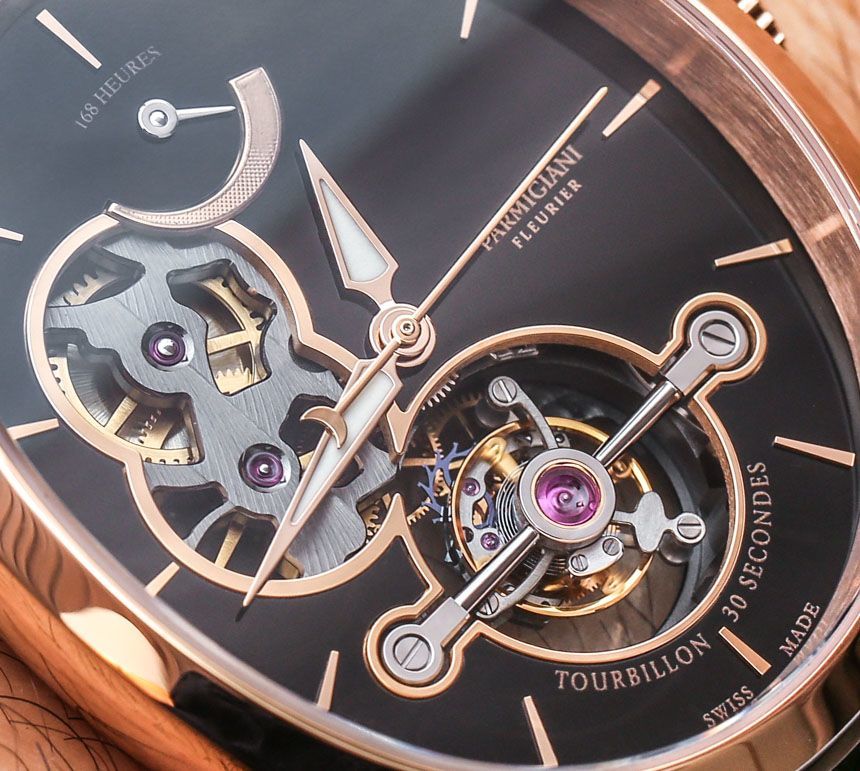 手表內(nèi)部是內(nèi)部制造和設(shè)計的 Parmigiani Calibre PF501 手動上鏈機(jī)芯,具有整整一周的動力儲存。這是通過表盤頂部方便的動力儲存指示器測量的,指示完整的 163 小時動力儲存。機(jī)芯以 3Hz(21,600 bph)運行,陀飛輪的獨特之處在于它每 30 秒旋轉(zhuǎn)一次,而不是每 60 秒旋轉(zhuǎn)一次。您還可以注意到機(jī)芯中硅部件的使用,例如擒縱機(jī)構(gòu)。