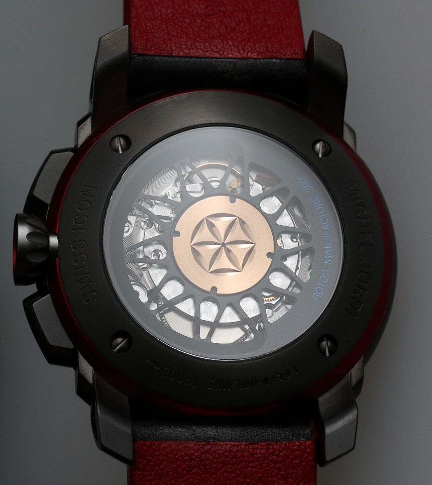 在 Jordi Chronograph Red Horizo??n 手表的背面,您會(huì)發(fā)現(xiàn)機(jī)芯上方有一個(gè)藍(lán)寶石水晶展示底蓋。手表使用的擺陀由 Jordi 內(nèi)部專門制造,看起來(lái)好像完全環(huán)繞整個(gè)機(jī)芯,而不是半圈。轉(zhuǎn)子大部分是黑色的,類似于車輪,而中心刻有漂亮的設(shè)計(jì),看起來(lái)是未完成的黃銅。這是一個(gè)漂亮的轉(zhuǎn)子,盡管它背后似乎沒(méi)有任何明顯的主題。