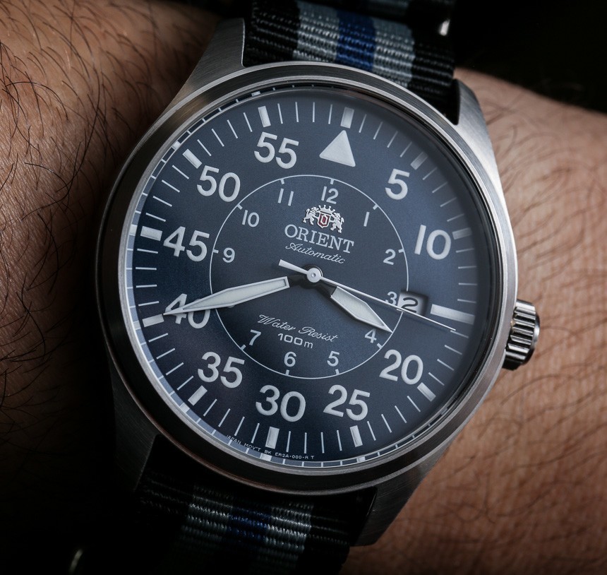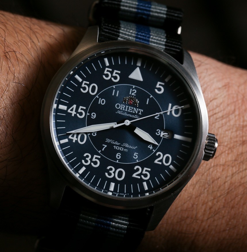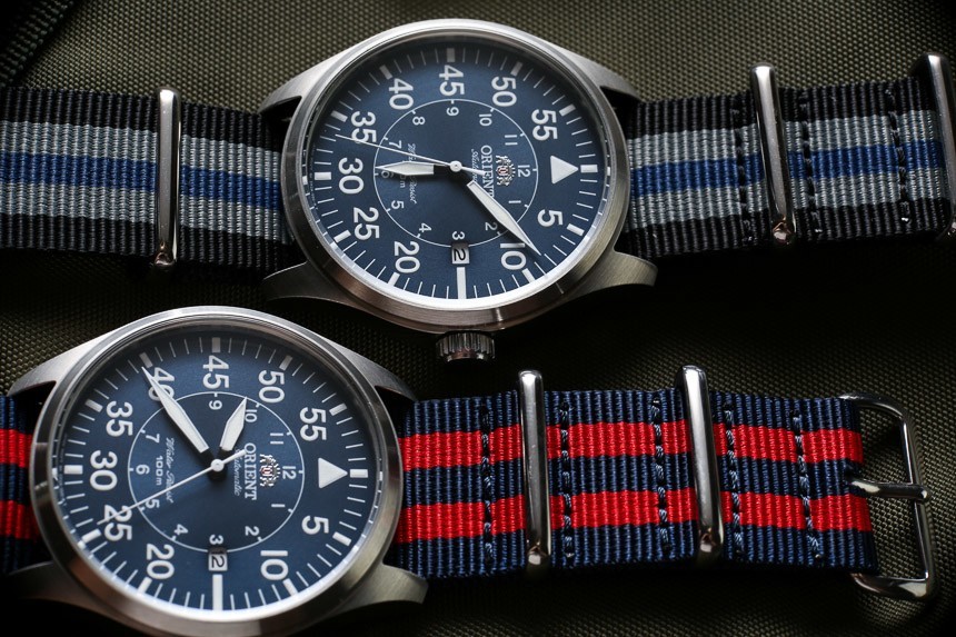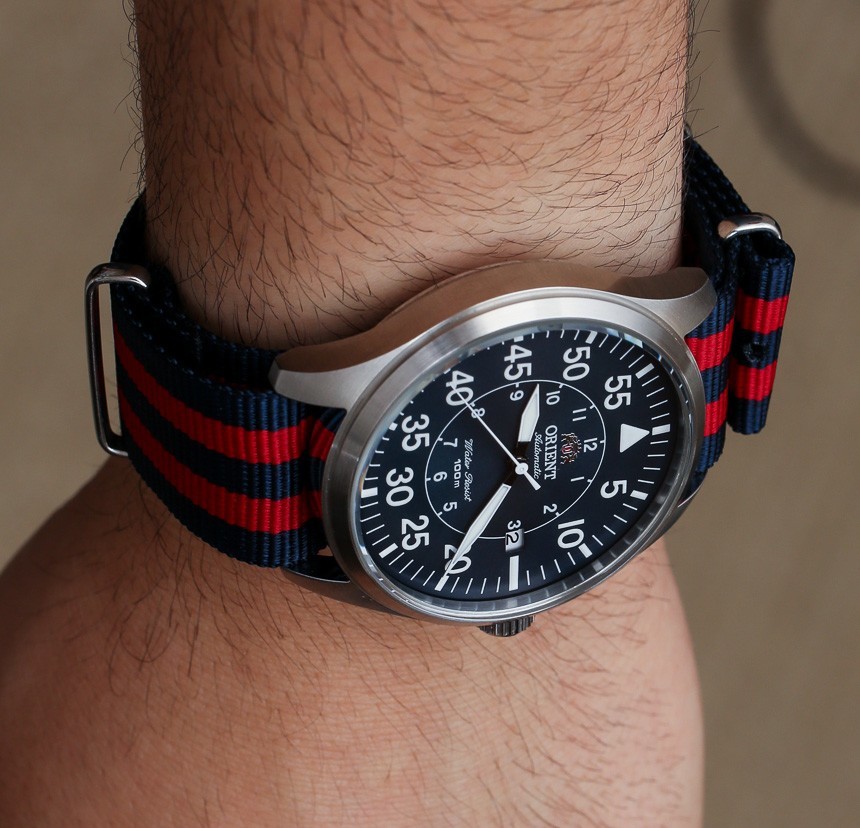 在混合藍色或藍紅 NATO 表帶上,我認為 Orient Flight 比在棕色表帶上更生動。如果您想要更樸素的外觀,我建議您選擇黑色表殼和黑色表帶表盤的 Flight(參考號 FER2A001B0)。選擇藍色表盤的版本時,您顯然希望佩戴一款具有個性的手表。如果那是您的目標,那么換掉表帶是一個有趣的主意——當然不僅僅是為了這款手表。