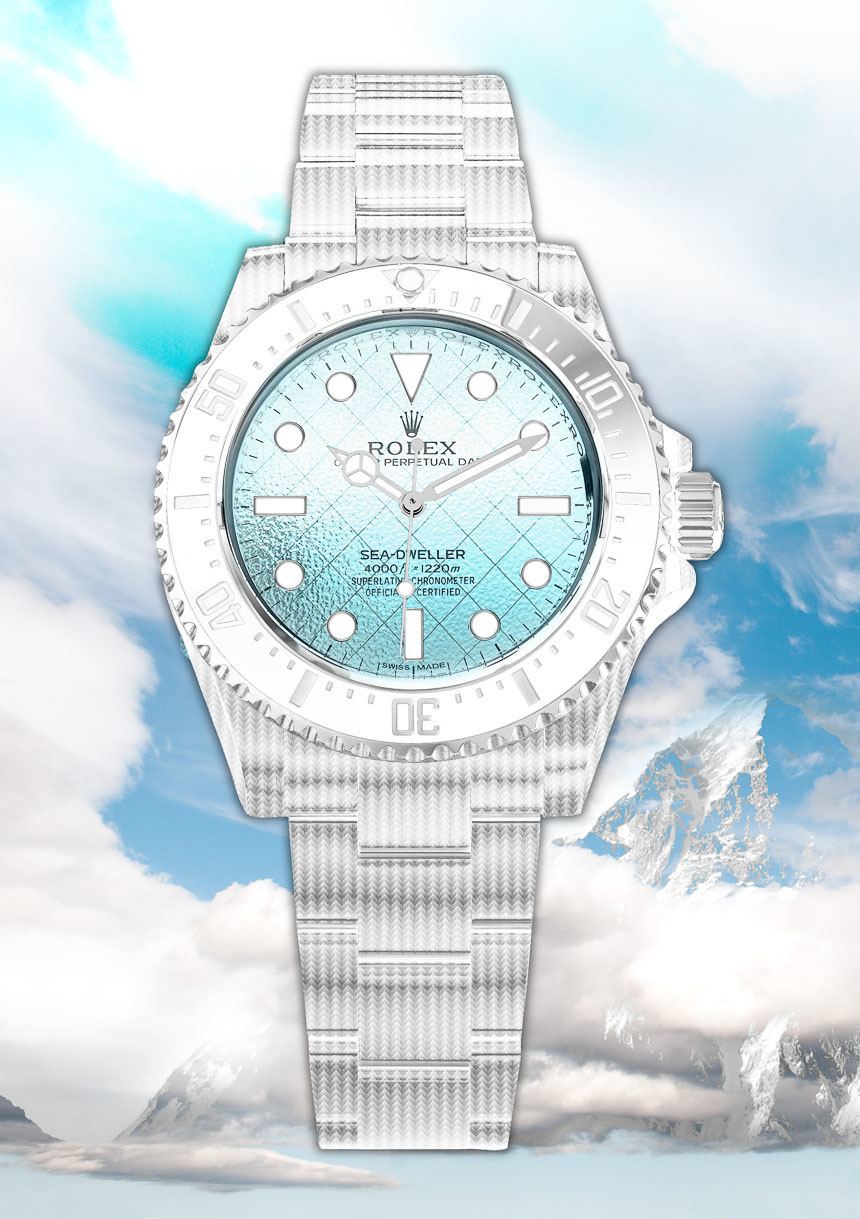 如果勞力士海使型 4000 是一款超輕型時計會怎么樣?這對于受空氣和云啟發的東西來說是有意義的。勞力士 Sea Dweller 4000 Air 概念將是“一款輕巧的彩色手表。高科技材料將使它極輕但幾乎堅不可摧。Sea-Dweller Air 給佩戴者一種錯覺,你最好把它戴在手腕上,否則它會像氣球一樣飄走。”