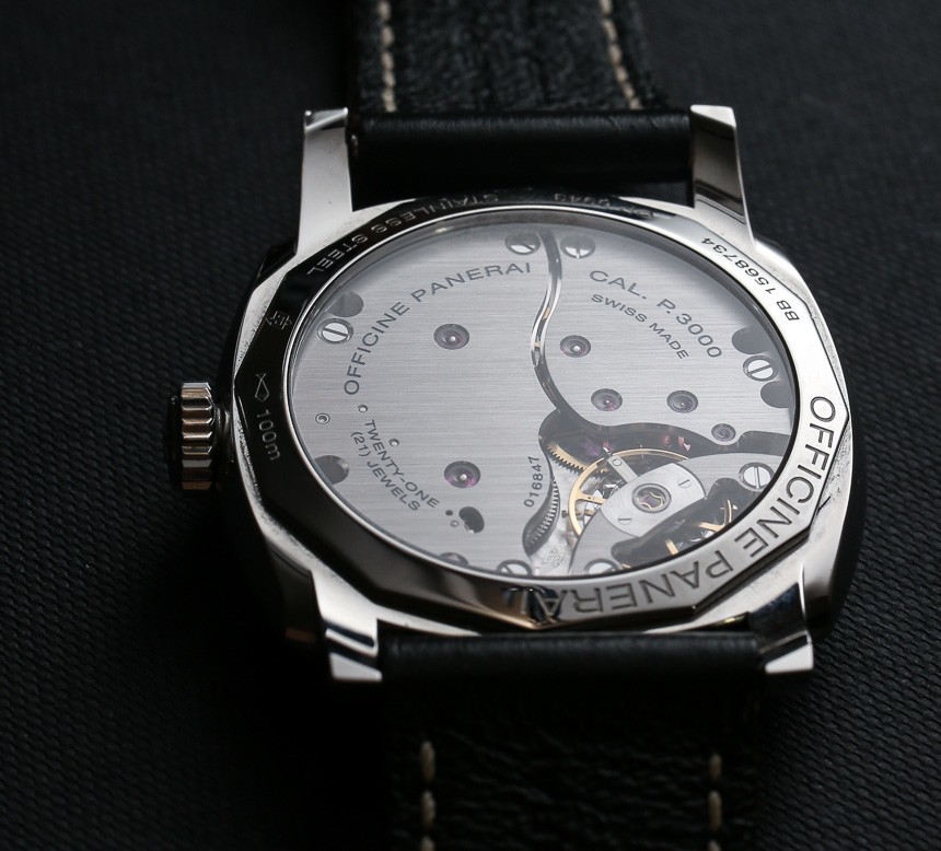 P.3000 是一款簡單而優雅的機芯。表橋設計極具吸引力,工業設計與優雅的結合顯而易見,很難像沛納海那樣精通。P.3000 以 21,600 bph (3Hz) 的頻率運行,具有 72 小時的動力儲存。在功能上,機芯提供帶小秒盤的時間和日期。當您將表冠拉出一個位置時,時針會在一小時內移動一圈,這對于旅行以及如何設置日期很有用。盡管與傳統的快速設置日期相比,它確實使調整日期有點麻煩。