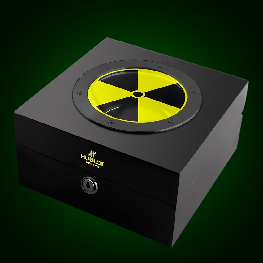 Hublot 決定將 Atomic D-38 基于其新的 45 毫米寬更新 Big Bang 表殼,并開發(fā)一種特別適合手表放射性特性的獨(dú)特復(fù)雜功能。Hublot 理解,甚至建議訂購 Atomic D-38 的顧客不要一直佩戴它。事實(shí)上,就像陳年烈酒一樣,一次只能喝少量。當(dāng) Big Bang Atomic D-38 腕表不使用時,宇舶表提供了一個鉛質(zhì)展示盒,用于存放未佩戴的腕表,以保護(hù)兒童和動物的生命安全。
