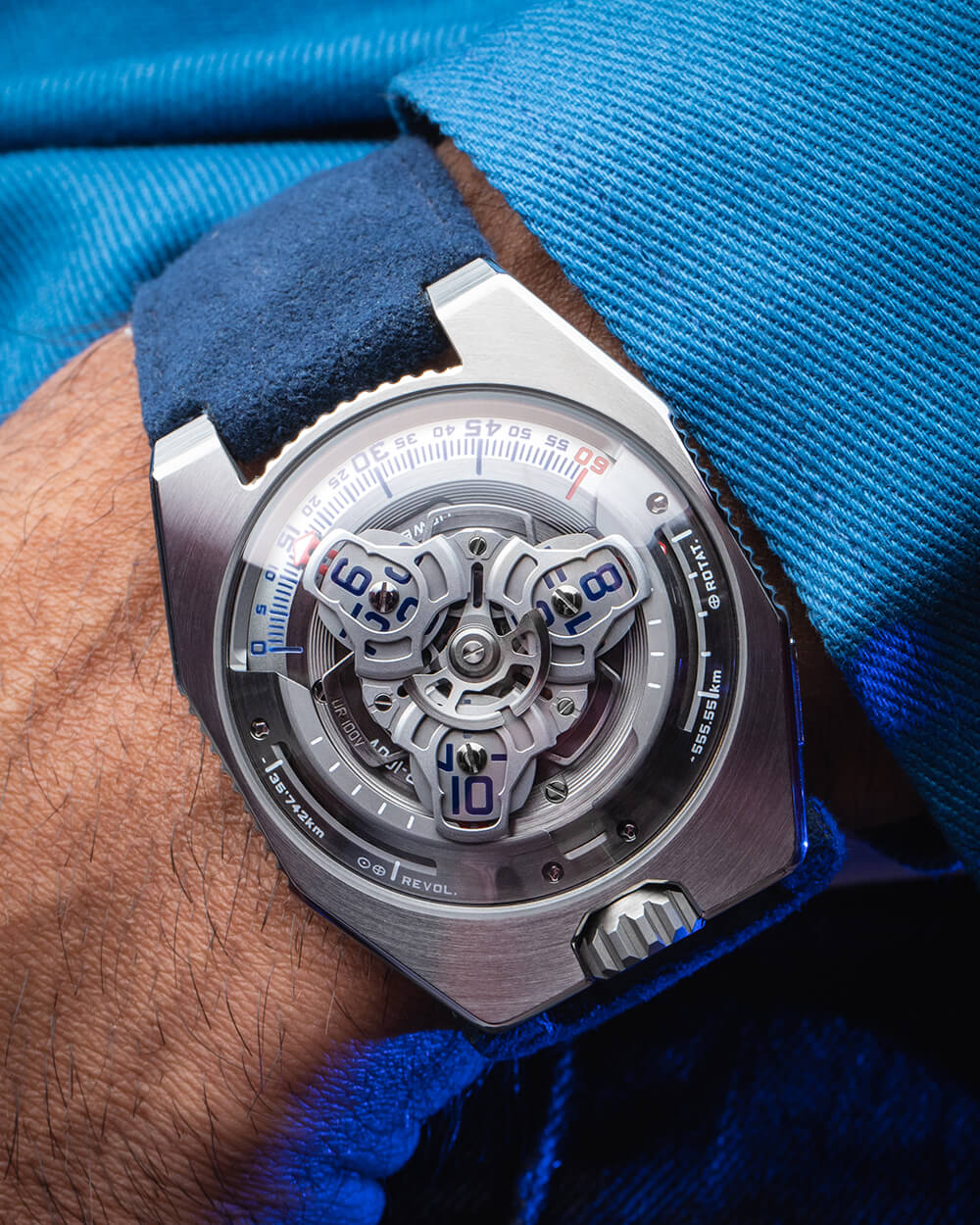 除了單色金屬外,唯一的亮點是藍色小時數字和分鐘刻度,以及紅色分鐘箭頭和60秒標記。飾有配有鈦金屬扣的藍色阿爾坎塔拉表帶,這是唯一一款你可以說少即是多的 Urwerk。
