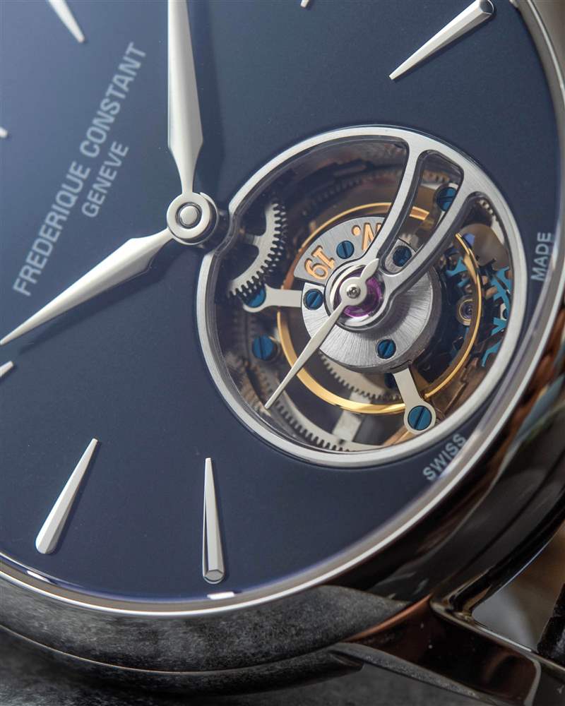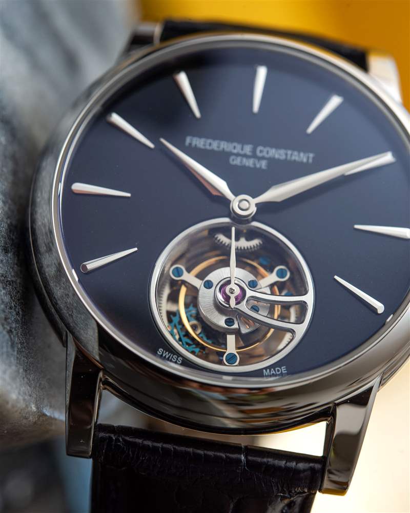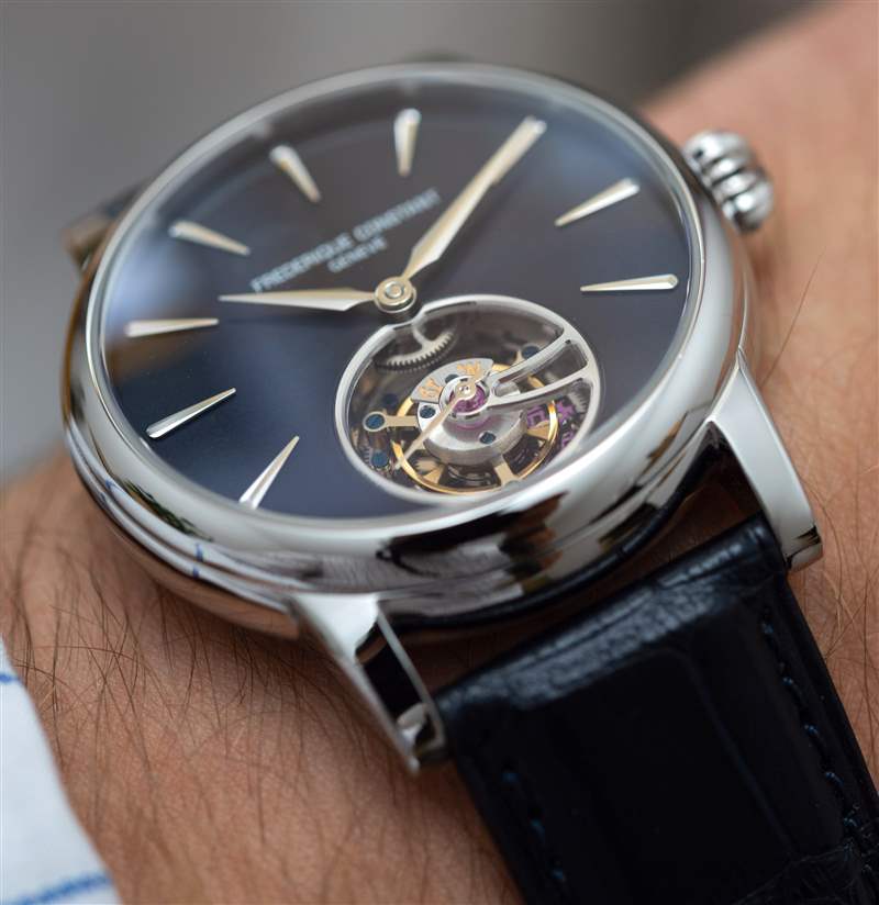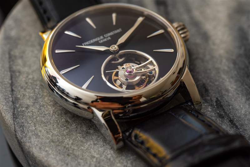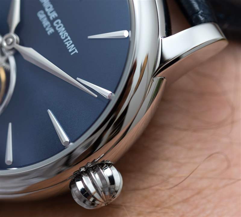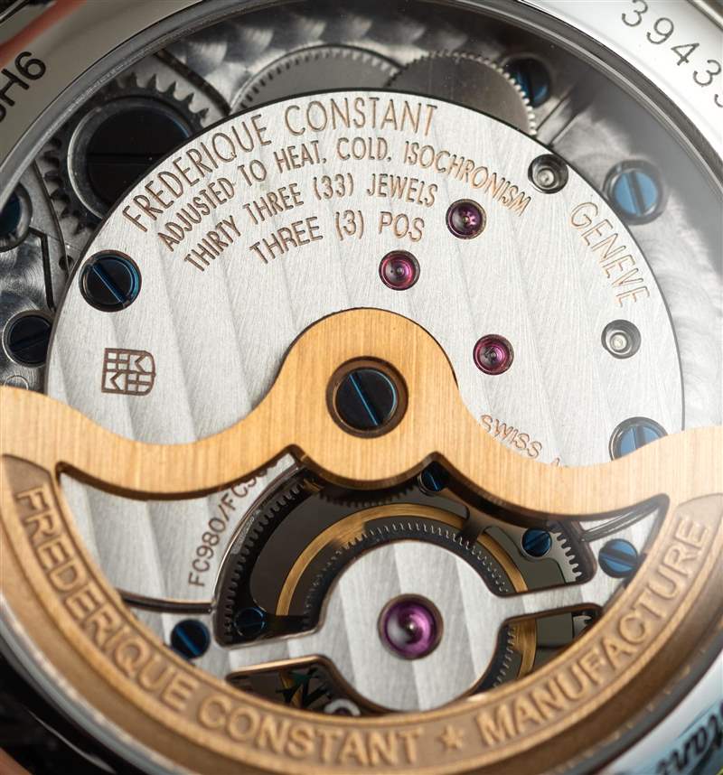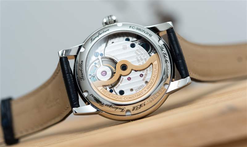 巨大的指針以其體積、復(fù)雜的形狀和明顯的縱向彎曲給人留下了深刻的印象。它們也是 FC-980 自產(chǎn)機(jī)芯的力量展示,該機(jī)芯不僅承載著巨大的時(shí)針和分針,還承載著陀飛輪組件。動(dòng)力儲(chǔ)存只有區(qū)區(qū)38小時(shí),很短,但至少是自動(dòng)補(bǔ)充的。FC-980機(jī)芯調(diào)校為熱、冷、等時(shí)、三方位,但沒有說明是否是經(jīng)過認(rèn)證的天文臺(tái)表。