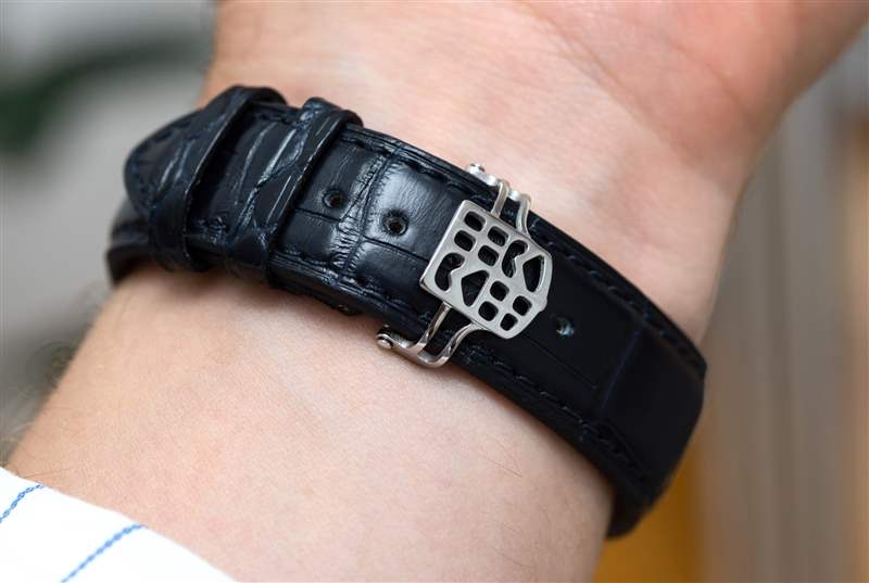 戴在手腕上,自制經(jīng)典陀飛輪腕表給人一種真正優(yōu)雅的感覺,專為日常佩戴而設(shè)計(jì)——也就是說,在辦公室里日常佩戴。這不是“看看這個(gè)!”?陀飛輪的展示只是為了將其置于敲詐比特幣百萬富翁沖動(dòng)購買者的范圍內(nèi)。這是一款相對低調(diào)、內(nèi)斂的手表,看起來復(fù)雜而昂貴,但絕不令人討厭或礙眼。人們很容易想象跨國公司的高級(jí)經(jīng)理或工程師會(huì)穿著它。簡潔的細(xì)節(jié)包括,單個(gè)生產(chǎn)編號(hào)不僅可以在底蓋上讀取,還可以在陀飛輪框架的頂部讀取——功能性機(jī)芯組件具有如此程度的定制是很少見的。擒縱輪上刻有康斯登標(biāo)志,閃爍著紫色和藍(lán)色的光芒,這是因?yàn)樗怯晒柚瞥傻摹T撈放剖褂玫牟粌H僅是這個(gè)組件 – 了解他們的 40Hz(是的,四十赫茲)這里采用硅制成的整體式擒縱機(jī)構(gòu)。折疊扣上還帶有品牌標(biāo)志,這是一個(gè)不錯(cuò)的主意,盡管執(zhí)行起來并不像某些人想象的那么清晰。