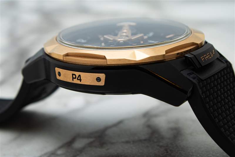 當(dāng)然,實(shí)際上 Freak ONE 并沒(méi)有什么平庸之處,仔細(xì)觀察紅金表圈就可以立即看出這一點(diǎn)?;谶@種拉絲和拋光元件中尖銳的刻面圖案,這個(gè)表圈可能看起來(lái)不對(duì)齊,但這是 Freak ONE 獨(dú)特的上鏈和時(shí)間設(shè)置系統(tǒng)的唯一真正的視覺(jué)線索。翻轉(zhuǎn) 6 點(diǎn)鐘位置的“Freak”牌,旋轉(zhuǎn)表圈就會(huì)解鎖,但旋轉(zhuǎn)的不僅僅是表圈本身。扭轉(zhuǎn)這個(gè)雙向表圈還可以向前和向后調(diào)整時(shí)間設(shè)置,為佩戴者提供與 Freak ONE 啟動(dòng)對(duì)話的齒輪系的大規(guī)模觸覺(jué)連接。在背面,藍(lán)寶石顯示屏底蓋同樣非正統(tǒng)。通過(guò)逆時(shí)針旋轉(zhuǎn)底蓋外環(huán),佩戴者可以手動(dòng)為機(jī)芯上弦,盡管 Freak ONE 的創(chuàng)新上鏈系統(tǒng)使得這一點(diǎn)基本上沒(méi)有必要(稍后會(huì)詳細(xì)介紹)。雖然 Freak ONE 的外殼非常耐磨,而且充滿了有趣的花招,但它的致命弱點(diǎn)就是防水。這是該手表日常佩戴理念面臨的最大障礙,因?yàn)?30 米的深度等級(jí)讓 Freak ONE 根本無(wú)法勝任許多運(yùn)動(dòng)場(chǎng)合的任務(wù)。