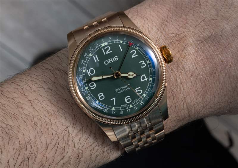 當然,這個新系列的豪利時大皇冠指針日期模型最大的吸引力之一就是它的全青銅表鏈。Oris 之前曾在 Divers 65 系列中嘗試過青銅表鏈的概念,但這是 Big Crown Pointer Date 第一次得到同樣的處理。然而,真正使它與 Diver 65 迭代不同的是,首先要完全用青銅制作手鐲的難度。由于青銅是一種較軟的金屬,因此在手鏈中加工每個單獨的鏈節以使其均勻貼合可能比使用鋼制更棘手,因為后者品牌很習慣于塑形。除此之外,還有銅綠因素需要考慮。銅綠實際上生長在青銅表面的外側,隨著這一層變厚,隨著公差的縮小,它可能會使手鏈鏈節變粘。最后,有一個問題是青銅銅綠可以通過摩擦擦掉,沒有人想要在他們的皮膚上留下一個綠色的銅綠環。Divers 65 手鏈的三連桿結構使這些問題更容易解決,但 Oris 在這里使用的多連桿設計有更多的活動部件,并提供更多的地方讓銅綠隱藏和堆積。Oris 通過在手鐲底部涂上一層抑制銅銹的涂層解決了大部分這些問題,但這款手鐲的加工水平本身也令人印象深刻。在手腕上,它肯定會引起注意,但它也引起人們注意鋼和青銅之間的另一個區別:重量。青銅的體積比不銹鋼重約 10%,雖然這種差異不像金殼手表那么大,