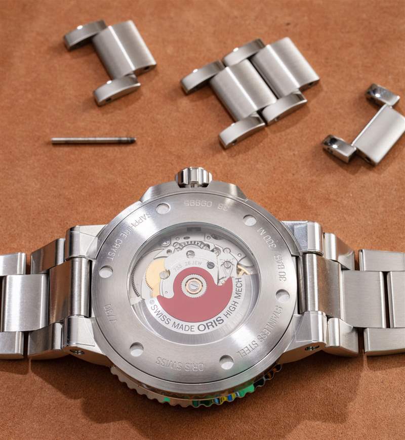 在表殼的背面,您可以通過用于手表正面的礦物玻璃窗藍(lán)寶石看到機(jī)芯)。能夠查看運(yùn)動(dòng)在潛水表上不太常見,因此這是一個(gè)不錯(cuò)的功能。Oris 將機(jī)械機(jī)芯稱為 Oris 733 機(jī)芯。它是瑞士制造的 Sellita SW200-1 自動(dòng)機(jī)芯(或多或少是 ETA 2824-2 的克隆)。機(jī)芯并沒有真正的裝飾,但它確實(shí)有標(biāo)志性的紅色 Oris 自動(dòng)轉(zhuǎn)子。機(jī)芯以 4Hz 頻率運(yùn)作,動(dòng)力儲(chǔ)存 38 小時(shí)。機(jī)芯沒有問題,但這與我寧愿去支付 SW200 一樣昂貴。我更希望 Oris 使用稍微精細(xì)的 SW300,或者至少為他們用于 Aquis Date 的 SW200 機(jī)芯提供一些裝飾。照這樣說,