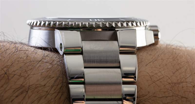 鑒于手鏈如此厚實(shí),表耳處的寬度為 24 毫米,為了佩戴舒適,它明顯變窄。我確實(shí)喜歡手鐲端耳的樣式,當(dāng)然,Oris Aquis 的可用橡膠表帶也有類似的體驗(yàn)。話雖如此,但大自然有專有設(shè)計(jì),如果您不想使用 Oris 提供的表帶或手鏈,則只能使用 Oris 或其他特殊形狀的表帶和手鏈。