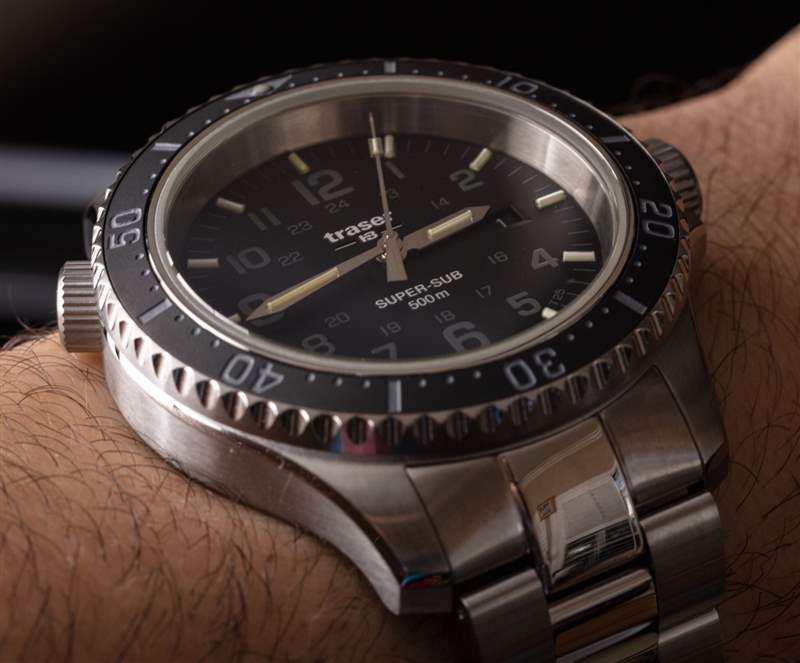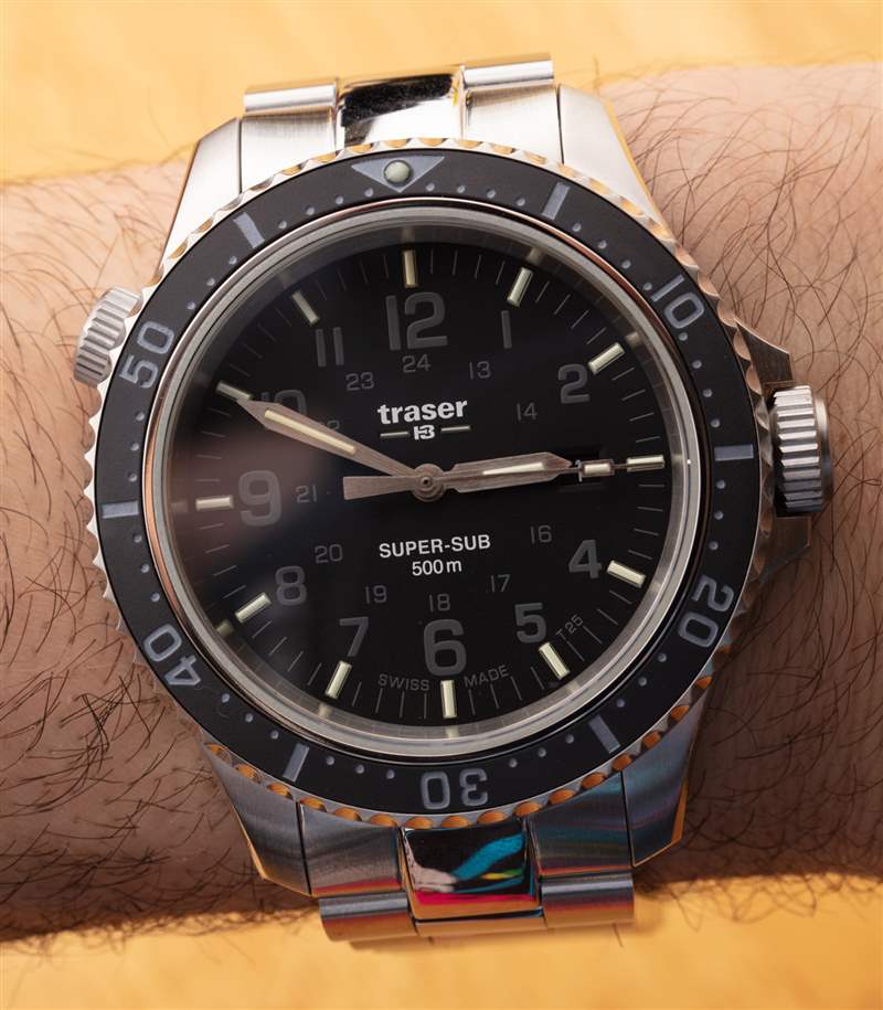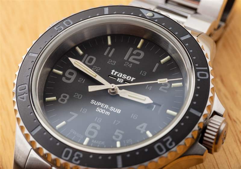 P67 SuperSub T100 型號(hào)使用較粗的扁平氣管作為時(shí)標(biāo)。此處的照片代表 T25 參考 109378 P67 SuperSub 手表。確實(shí),它在黑暗中不如 T100 型號(hào)那么亮,但在我看來(lái),它在視覺(jué)上也更具吸引力,可以更好地日常佩戴。這是黑色表盤(pán)表款,搭配相配的精鋼表鏈。Traser 還生產(chǎn)帶有橙色或藍(lán)色表盤(pán)的 P67。確實(shí),手有點(diǎn)短,但易讀性仍然很好。我的懷疑是由于手的重量,手的長(zhǎng)度沒(méi)有達(dá)到應(yīng)有的長(zhǎng)度。P67 SuperSub 系列使用瑞士制造的 Ronda 石英機(jī)芯,在更傳統(tǒng)的機(jī)械機(jī)芯中,這種機(jī)芯的指針并沒(méi)有盡可能重。