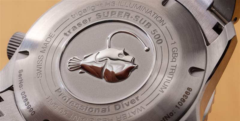 表迷們會(huì)感嘆 P67 SuperSub 沒(méi)有機(jī)械機(jī)芯,但 Traser 很容易反駁,提醒人們對(duì)于許多應(yīng)用來(lái)說(shuō),精確的石英計(jì)時(shí)比機(jī)械機(jī)芯更有效。大多數(shù) Traser 手表實(shí)際上是石英的,盡管該品牌確實(shí)提供機(jī)械型號(hào)(請(qǐng)參閱此處的 Traser P66 Automatic Pro 的 aBlogtoWatch 評(píng)論)。表殼背面是琵琶魚(yú)的圖案(原因很明顯,因?yàn)樵撋锞哂刑烊坏纳锇l(fā)光特性)。
