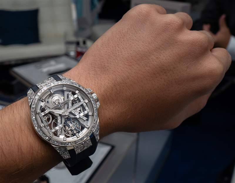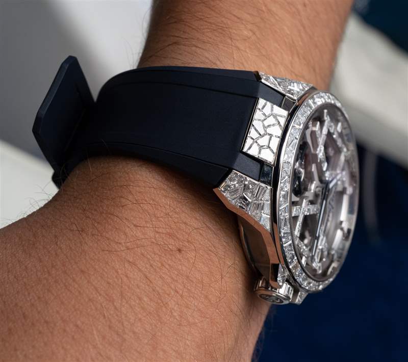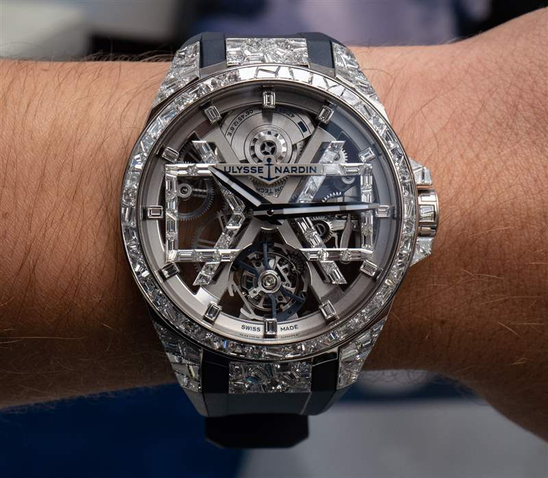 Sabatier 先生最值得稱贊的是他回答問題的深思熟慮的方法,以及他在將其他行業的聰明教訓借鑒到開發和制造機械手表的世界時毫不拘束。從視覺上看,您在圖片中看到的手表是 Ulysse Nardin Blast 的特殊“高級珠寶”版本:覆蓋著鉆石。該手表被稱為參考 1720-400BLE-3A/01 或 1720-400BLE-3A/00 Ulysse Nardin Sparkling Blast。表殼上共鑲嵌 211 顆鉆石(鉆石重量為 13 克拉)。45 毫米寬的表殼由 18k 白金制成,特殊的鉆石鑲嵌風格以更加有機的“裂紋鏡子”風格完成,極具陽剛氣息,在市場上也是獨一無二的。Ulysse Nardin Sparkling Blast 的價格是410,000 美元。