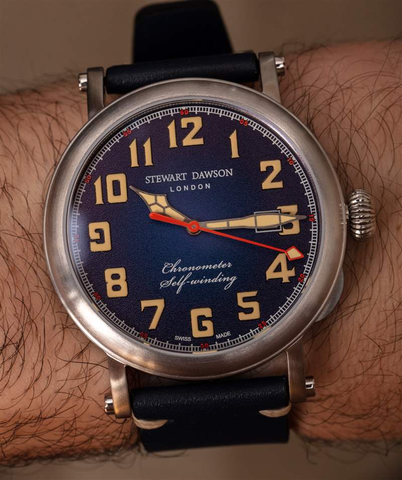 斯圖爾特道森的外觀并不太寒酸。至暗時刻共有三種表盤顏色,這是 REF。1940.A.SS.DH02 – 藍色(藍色表盤和配套表帶)。發光體涂得足夠厚,可以稍微抬高一點,顏色是一種有吸引力的“老化”奶油。它實際上比純白色更漂亮,更有吸引力。表盤上的日期窗口并沒有太大幫助,但除此之外,顏色、紋理和字體的混合對整體外觀來說效果很好。從時尚的角度來看,斯圖爾特道森獲得的不僅僅是及格分數。