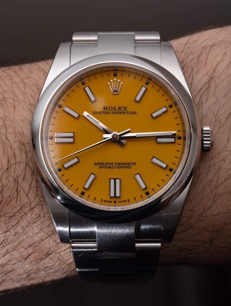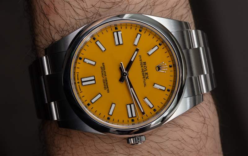 與紅色 Oyster Perpetual 表盤一樣,勞力士網(wǎng)站上的黃色表盤并不能完美地代表實(shí)際黃色表盤的外觀。實(shí)際的黃色表盤要輕一些,但只是輕微的。然而,在我看來,勞力士網(wǎng)站上的黃色比珊瑚紅要好得多——所以,你看到的顏色接近 Oyster Perpetual 41 表盤上的實(shí)際顏色。更重要的是,雖然珊瑚紅在顏色上更注重時(shí)尚,但黃色確實(shí)讓人感覺這兩種選擇中更具運(yùn)動(dòng)感——盡管對于那些想要?jiǎng)诹κ客蟊眢w驗(yàn)而不想要傳統(tǒng)保守風(fēng)格的人來說,這兩種選擇都是非常有吸引力的選擇來自目前周圍的大多數(shù)勞力士時(shí)計(jì)。