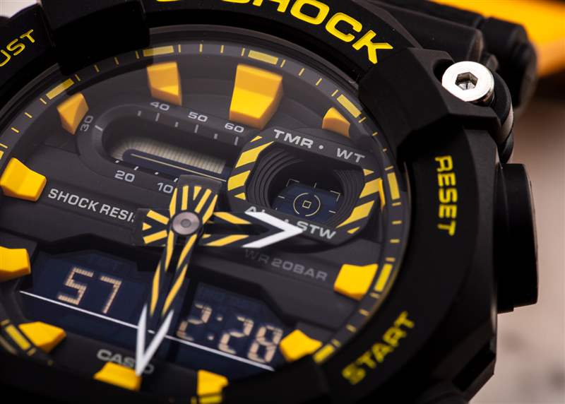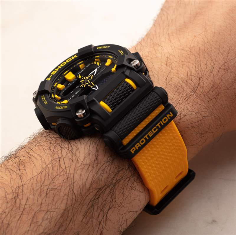 考慮到價格實惠,但采用大膽的設計和激進的姿態,新的卡西歐 G-Shock?GA900A 系列(此處為參考 GA900A-1A9)是日本制表商針對城市時尚市場(或其他需要耐用手表的地方)。鑒于我對“黑色和黃色”手表的興趣,我喜歡這款帶有黑色和黃色條紋模擬指針的 GA900A 警示膠帶/建筑拖拉機式版本。
