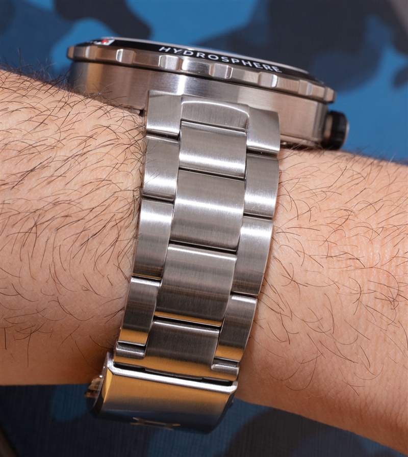 作為一款潛水表,Hydrosphere 防水深度達(dá) 250 米,并內(nèi)置自動(dòng)排氦閥。表殼較大,寬 45 毫米,但由于相對(duì)較窄、粗短的表耳,它的磨損較小。更重要的是,由于表耳放置在表殼的底部,Hydrosphere 感覺(jué)就像騎在手腕上,這提高了舒適度,并使整體尺寸更適合較小的手腕。表殼厚度也接近 15 毫米,采用圓頂藍(lán)寶石水晶表鏡。它不會(huì)感覺(jué)太厚,但這本身就不是一塊小手表。盡管據(jù)說(shuō)表殼有 45 毫米寬,但表圈本身還是有點(diǎn)寬,大約 47 毫米寬。再說(shuō)一次,這是一款更大的時(shí)計(jì),但它的佩戴比它的體積建議的要小一些。廣告訊息廣告信息結(jié)束