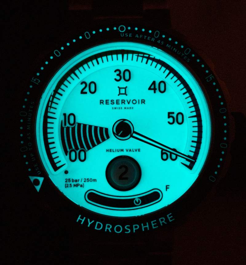 Reservoir 為 Hydrosphere 設(shè)計(jì)了一個(gè)相當(dāng)保守的底蓋——我認(rèn)為這有點(diǎn)錯(cuò)過(guò)了機(jī)會(huì)。不,我不想要一些俗氣的潛水員雕刻,但某些主題視覺(jué)效果或運(yùn)動(dòng)視圖可能有助于為這道美味的鐘表菜肴增添風(fēng)味。說(shuō)到視覺(jué)效果,這款 Hydrosphere 的 Air Gauge 版本有一個(gè)完全涂漆的表盤(pán)。流明并沒(méi)有涂得特別厚,但表盤(pán)上有很多。不幸的是,跳時(shí)窗口中的數(shù)字沒(méi)有涂上夜光漆。因此,雖然 Hydrosphere Air Gauge 的黑暗效果看起來(lái)很酷,但它受到一些小的實(shí)用性問(wèn)題的影響,我覺(jué)得 Reservoir 品牌將在未來(lái)的潛水表型號(hào)中進(jìn)行補(bǔ)救,因?yàn)檫@些產(chǎn)品太好了,不能持續(xù)很長(zhǎng)時(shí)間未來(lái)。