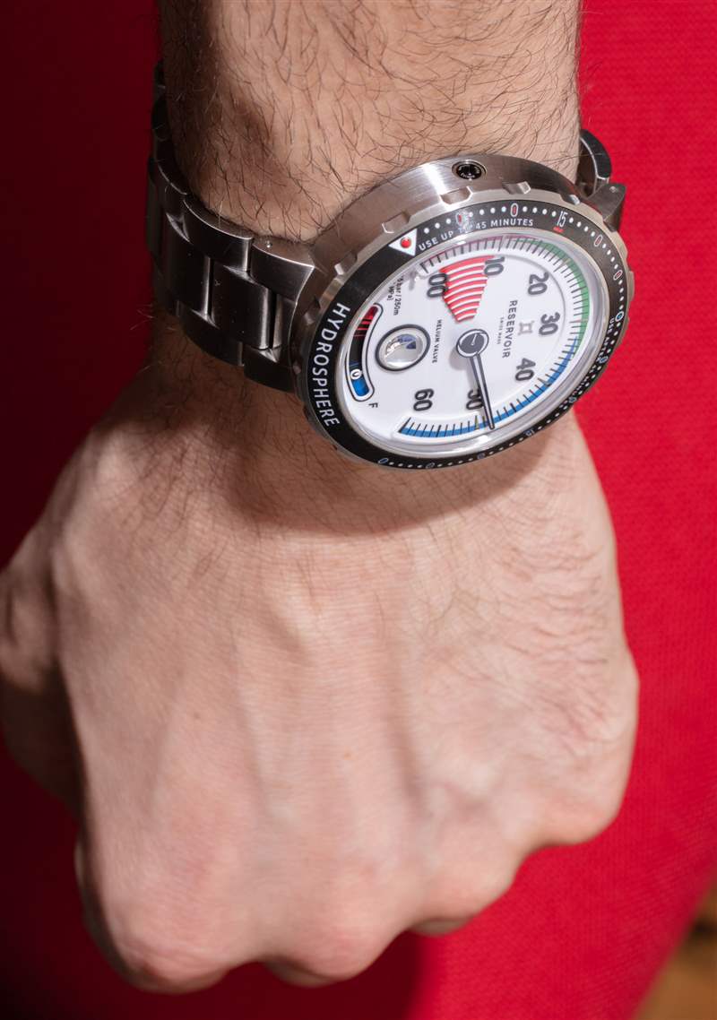 Reservoir 出售每款 Hydropshere 鋼質(zhì)腕表,配有匹配的金屬表鏈和定制的橡膠表帶。要將它們換掉,您需要使用螺絲刀,但除此之外,我贊賞該公司提供兩種外殼附件選項(xiàng)。現(xiàn)實(shí)情況是,如果你真的帶著手表潛水,橡膠表帶更實(shí)用,因?yàn)樗梢宰屖直砀踩?。如果您在?zhèn)上佩戴 Hydrosphere 作為生活方式手表(我認(rèn)為這將主要用于這 – 就像其他潛水手表一樣 – 最終會(huì)出現(xiàn)),那么手鐲會(huì)提供稍微更精致、更高端的感覺(jué)。