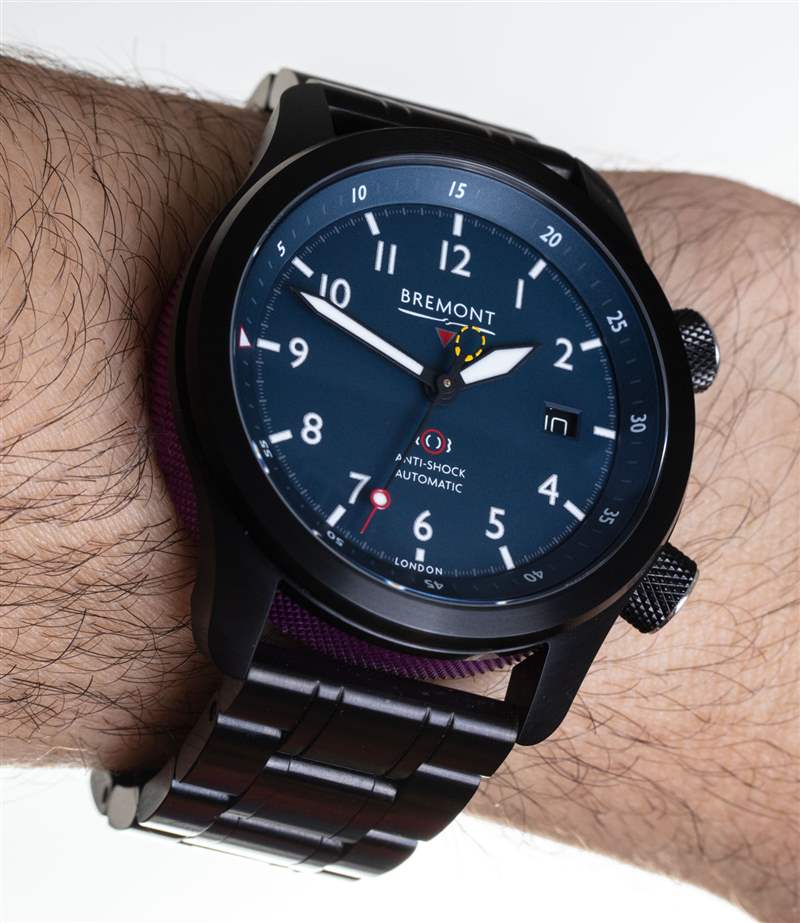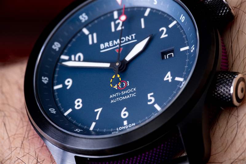 手表的表盤周圍是一個(gè)內(nèi)部旋轉(zhuǎn)的“roto-click”表圈,上面有一個(gè) 60 分鐘刻度。它通過位于表殼右側(cè)的兩個(gè)表冠中的較低者進(jìn)行操作。手表內(nèi)部是一個(gè)名為 BE-36AE 機(jī)芯的 Bremont 機(jī)芯。機(jī)芯開始時(shí)就像瑞士制造的 ETA 2836-2 自動(dòng)(4Hz,38 小時(shí)動(dòng)力儲(chǔ)存)。Bremont 對(duì)其進(jìn)行了修改,并賦予其 COSC Chronometer 認(rèn)證。如果您透過藍(lán)寶石水晶展示底蓋窗口觀察機(jī)芯,您會(huì)看到新的黑色組件,它是自動(dòng)上鏈系統(tǒng)的一部分。在保護(hù)自動(dòng)轉(zhuǎn)子與機(jī)芯其余部分連接的精密軸點(diǎn)時(shí),這種由 Bremont 設(shè)計(jì)和配備的組件比 ETA 庫存零件更耐沖擊。盡管機(jī)芯的展示讓 MBII 少了一些工具手表的信譽(yù),但在我看來,機(jī)芯的觀點(diǎn)是值得的。至少 Bremont 允許消費(fèi)者選擇實(shí)心或展示底蓋是否滿足他們的個(gè)人需求。