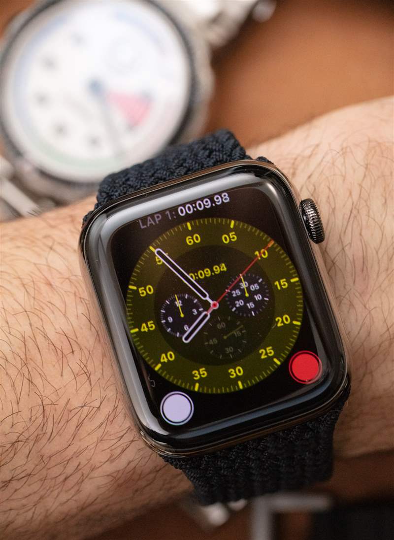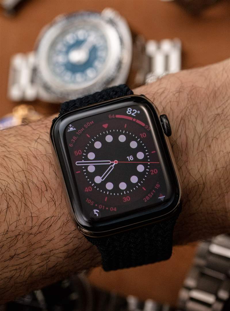 我手腕上的那個是 44 毫米長的鋼制版本,帶有“石墨黑”拋光涂層。它的防水深度為 50 米,屏幕上方有藍寶石水晶,表殼后部的 LED 上方還有額外的藍寶石水晶。盡管擁有更多功能和更亮的屏幕,但電池壽命仍然“全天”。我在 Apple 新的 Braided Solo Loop 表帶上佩戴了 Series 6 鋼,這是 Apple Watch 現在提供的兩種新的“彈力”表帶樣式的一部分。這些讓我回到曾經非常流行的Speidel Twist-O-Flex 肩帶我記得在 1980 年代一直看到。這些帶子不需要在手腕上調整大小或閉合;它們只是展開以適合您的拳頭和手腕。你如何調整它們的大小?你沒有。Apple 為 Solo Loops 表帶出售一長串尺寸(其中超過 10 種),因此您需要提前量好手腕才能獲得一個(或者在可能的情況下在 Apple Store 商店嘗試各種尺寸)。