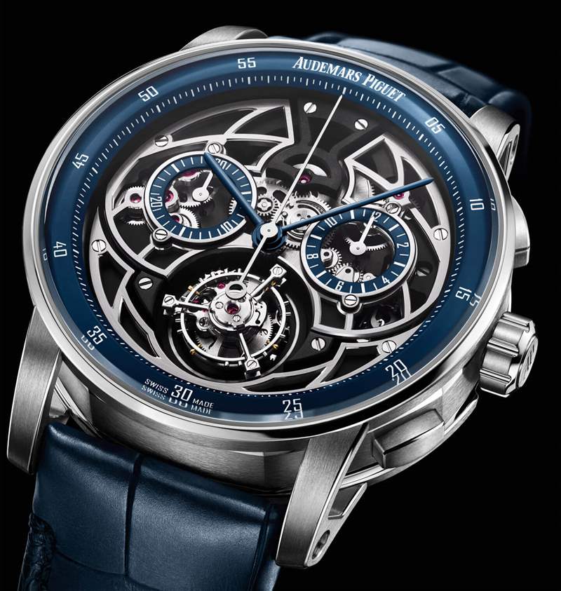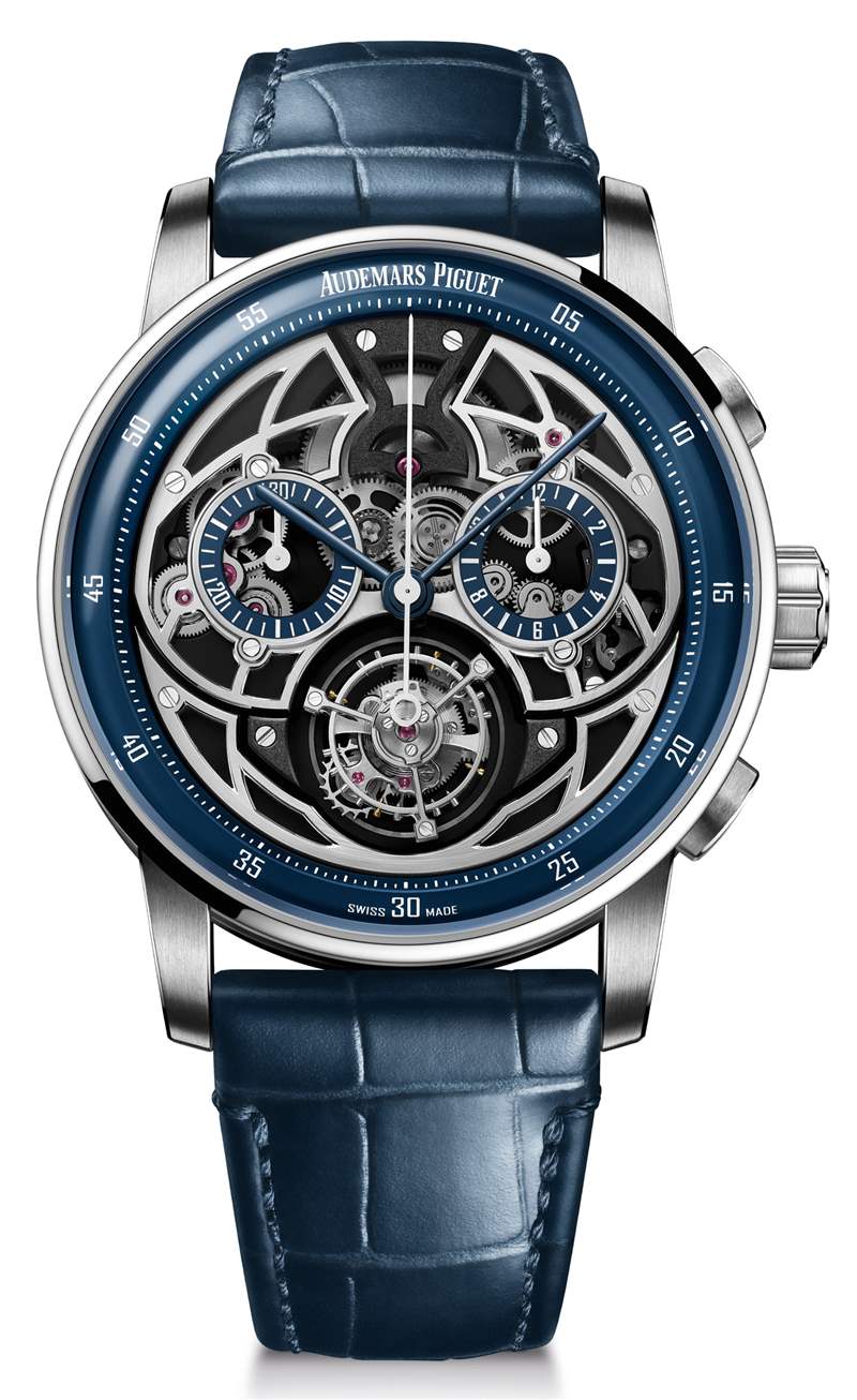 寶藍(lán)色漆用于裝飾表盤的法蘭環(huán)以及計(jì)時(shí)碼表子表盤上的法蘭環(huán)。藍(lán)色仍然是制表界非常流行的顏色,這讓 Code 11.59 自動(dòng)上鏈飛行陀飛輪計(jì)時(shí)碼表的第一版成為時(shí)尚潮流。我預(yù)計(jì)愛彼會(huì)將相同的表殼、表盤和機(jī)芯組合呈現(xiàn)在額外的金色或貴金屬表殼中,并使用不同的表盤顏色。可讀性可能是一個(gè)挑戰(zhàn),因?yàn)殚_放式表盤上的藍(lán)色指針在某些照明條件下可能很難發(fā)現(xiàn)(想想看,指針可能會(huì)長一點(diǎn)),盡管至少法蘭環(huán)有完整的分鐘和小時(shí)標(biāo)記。
