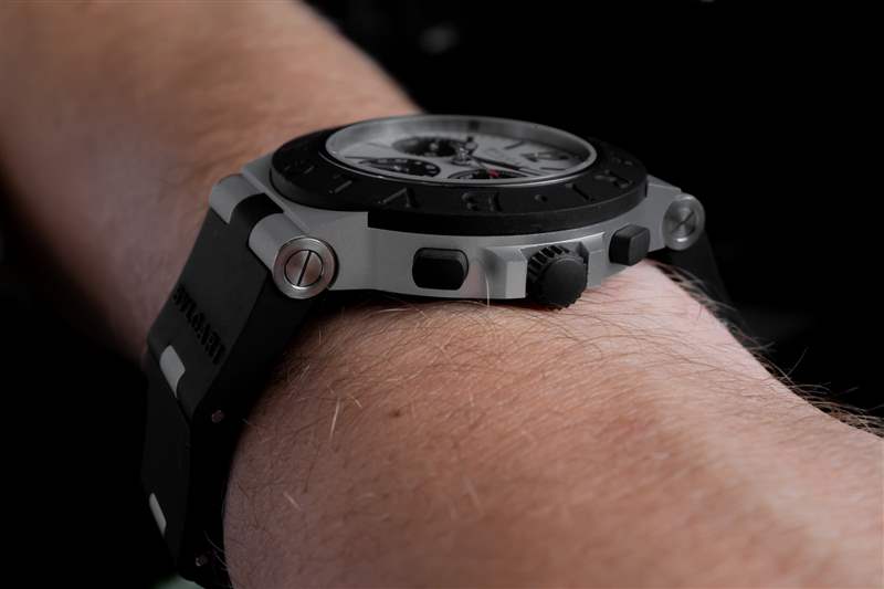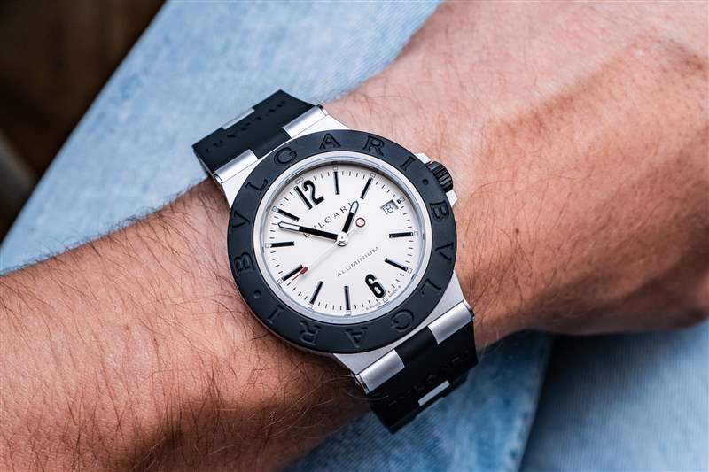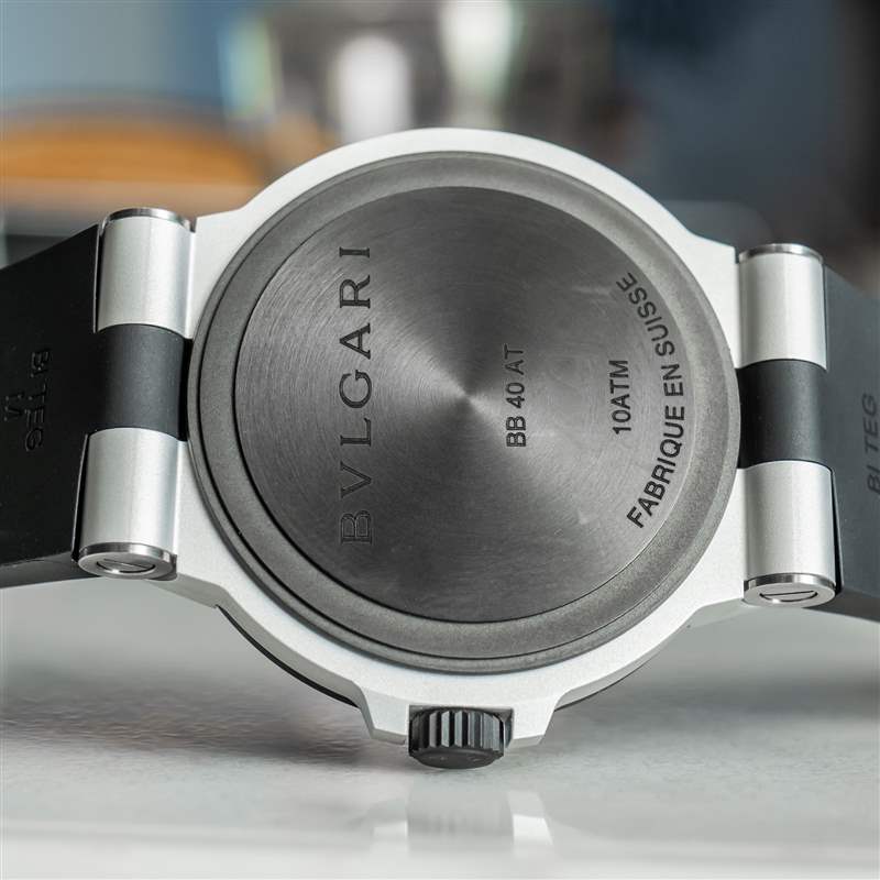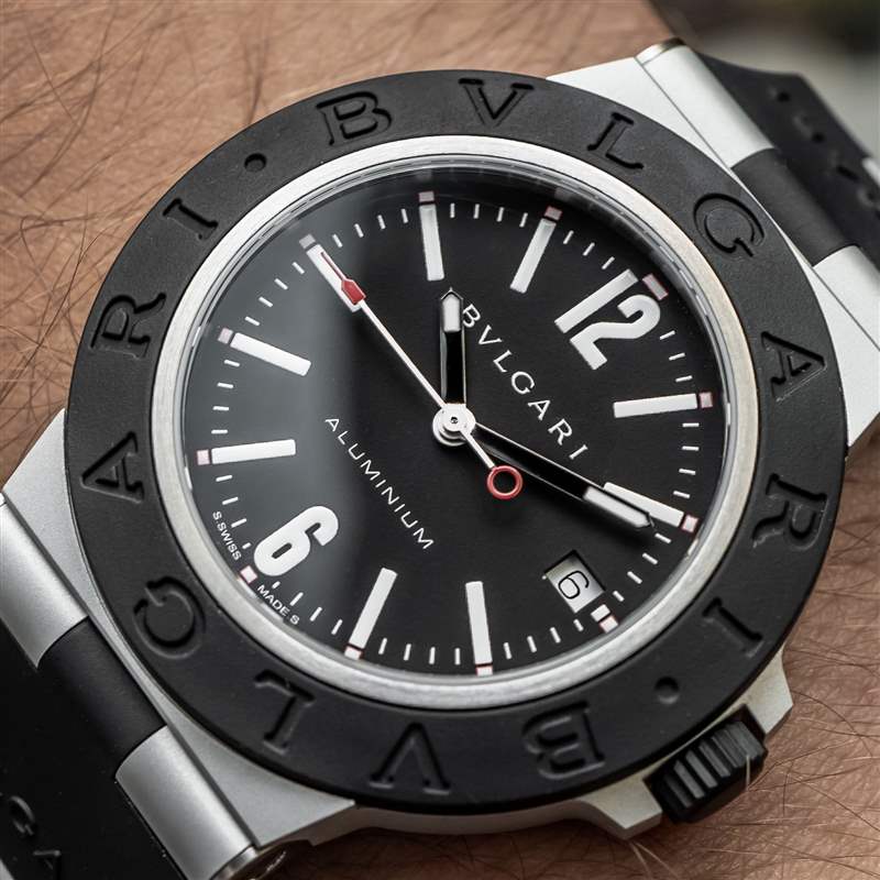 鋁的主要優點之一是它能夠注塑成型(相對容易)以及陽極氧化和呈現一系列顏色。鋁也很輕——甚至比鈦還要輕。和鈦一樣,鋁也比較軟,容易劃傷。更重要的是,鋁更容易變形,最好與“保險杠”和其他保護其免受沖擊的物理設計元素一起使用。因此,寶格麗鋁制手表采用黑色涂層保護“寶格麗寶格麗”表圈和 DLC 涂層鈦金屬底蓋。即使是橡膠表鏈上的前兩個鏈節也是涂膠鋁,以保護下面的金屬免受損壞。與鈦相比,鋁的受歡迎程度有所下降,