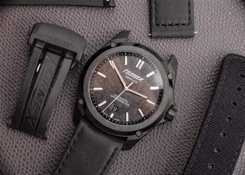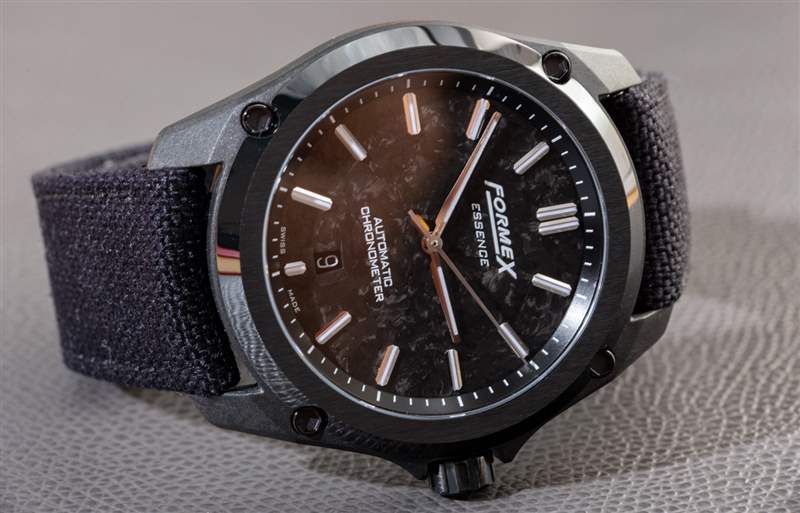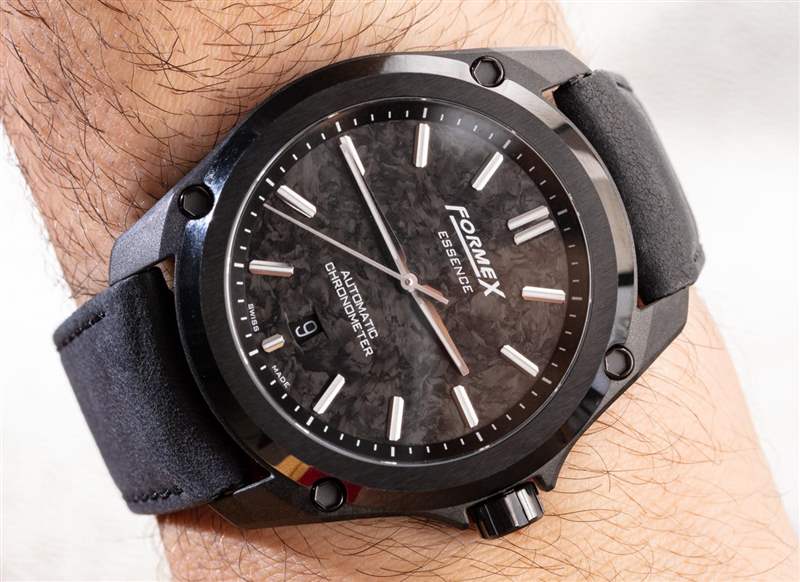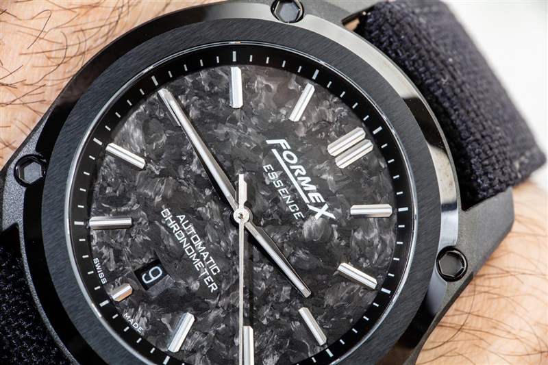 這也是獲得黑色手表的好方法。與其他具有有機紋理的鍛造碳材料不同,Essence Leggera 表殼非常均勻,按照工業標準“外觀完美”。它為手表注入了一種溫暖的有機感覺,Formex(對于這個特定版本的手表)使用了一個薄的鍛造碳表盤,當切割時,它具有更多的有機質感。其他版本的 Essence Leggera 有,例如,隕石表盤(用于 Essence Leggera Space Rock),以及更保守的表盤選項。我完全希望 Formex 在未來繼續使用 Essence Leggera 的各種美學變體。