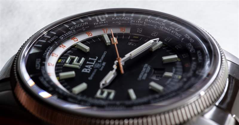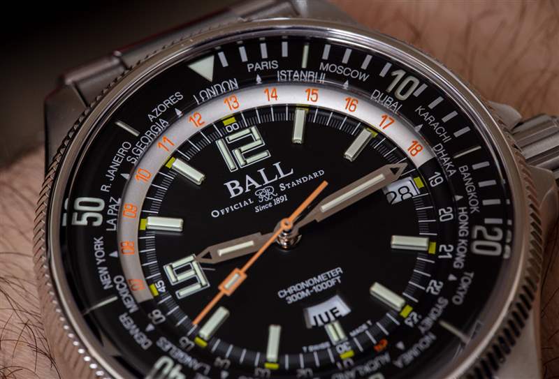 與往常一樣,Ball 充分利用了表盤指針和時(shí)標(biāo)上的自發(fā)光氚氣管。在黑暗中,Engineer Master II Diver Worldtime 是一個(gè)值得一看的景象。由于世界時(shí)間手表具有外圈和內(nèi)表盤的本質(zhì),與表殼的整體尺寸相比,手表上讀取時(shí)間的面感覺有點(diǎn)小。這沒什么大不了的,但是當(dāng)您的手腕上有一塊更大尺寸的手表時(shí),它確實(shí)需要一些時(shí)間來適應(yīng),并且用一個(gè)相對(duì)較小的表盤來讀取時(shí)間。表盤上方是一個(gè)略微圓頂?shù)?AR 涂層藍(lán)寶石水晶鏡面。