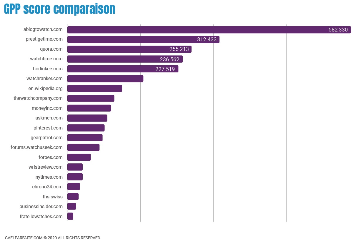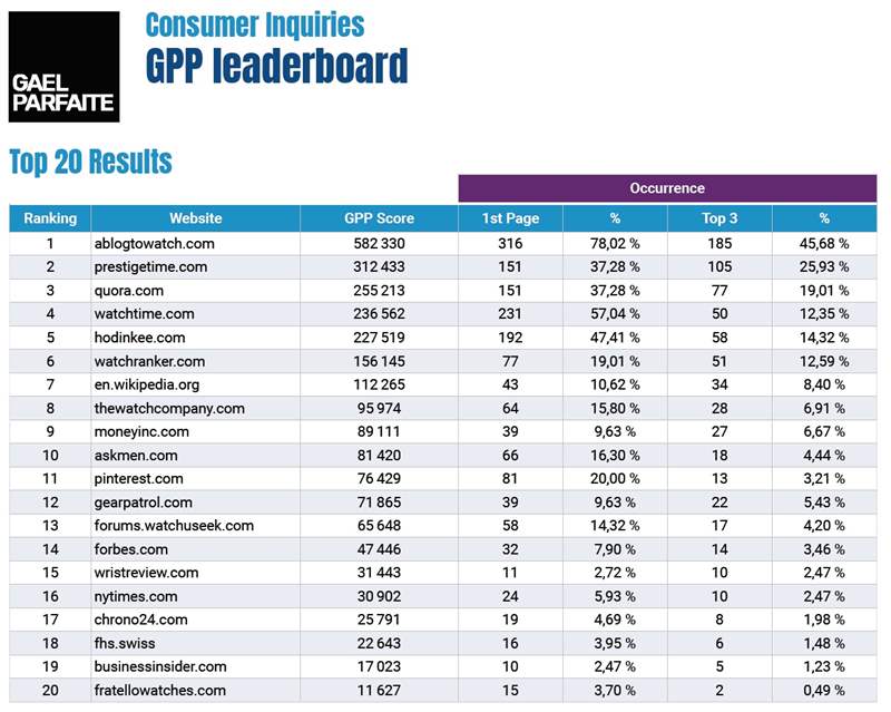 這項獨立研究首先選取了 Parfaite 先生認為與手表行業(yè)或手表消費者購買過程相關的 20 個網(wǎng)站,然后使用專為該項目創(chuàng)建的過程對它們進行評分。Parfaite 的方法包括一個稱為“GPP 分數(shù)”的指標,它是幾個查詢的性能指標的總和,例如搜索引擎排名、現(xiàn)場資產(chǎn)(例如社區(qū)評論的價值)以及網(wǎng)站整體如何被證明協(xié)助消費者決策過程。該報告進一步跟蹤了 20 個網(wǎng)站在 45 個不同流行手表品牌的各種搜索引擎查詢中的表現(xiàn)。廣告訊息廣告信息結束