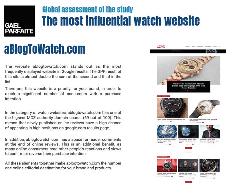 既然我已經(jīng)對我們缺乏參與這個過程保持透明,我可以說 Parfaite 先生的報告得出的結論是,aBlogtoWatch.com 是手表消費者決策過程中最具影響力的網(wǎng)站。為此,我只能感謝 aBlogtoWatch 團隊,以及更大的腕表愛好者和買家社區(qū),他們都遵循并相信我們的核心使命是成為熱愛和購買鐘表的人們值得信賴的資源。以下是我與 Gael Parfaite 關于報告的對話。可通過本文末尾的鏈接獲得報告完整 PDF 的鏈接。廣告訊息廣告信息結束