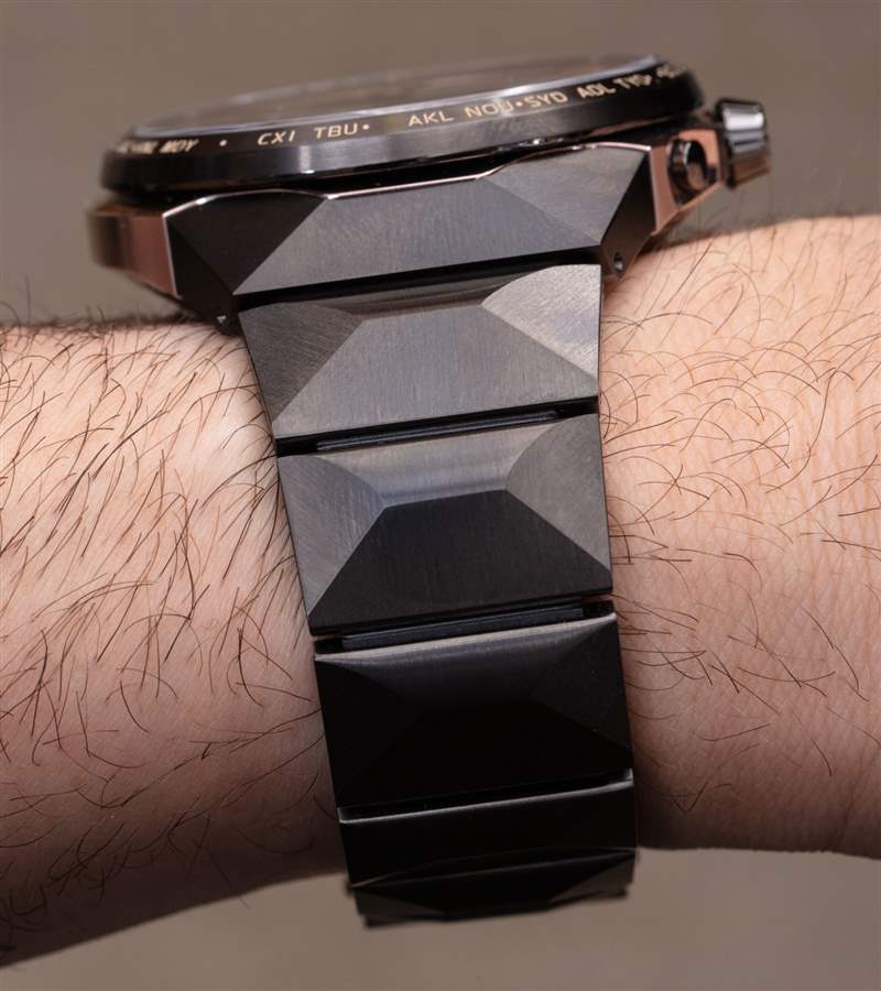 并非所有的一體式鏈式手鏈佩戴在手腕上都很舒適,但 Citizen 在這里做得很好。手鏈的內部實際上更多的是三環式,但外觀上卻是一個大致呈金字塔形的單環。一體式錐形手鏈的角度很吸引人,其獨特的設計和顏色在美學上也有點陽剛之氣。我認為這對手表來說是一個不錯的外觀,但考慮到需要加工和處理的許多單獨的鈦部件,它不可能大批量生產。