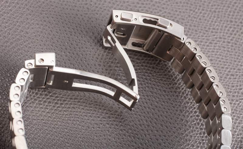 兩款限量版 PC-7 Team Aeromaster 腕表均配有金屬表鏈和定制表帶。雖然我主要是手鐲愛好者,但我實際上更喜歡這款手表的表帶。那不是因為手鐲有什么問題,而是更多關于它如何適合表殼。手鐲有點突出,使得手表在較小的手腕上佩戴起來不那么優雅,比如我自己的手腕。不同款式的表帶更適合較小的手腕。除了外觀有點普通外,手鐲制作精良。鏈節使用更大尺寸的螺釘連接,展開式表扣還包括一個微調系統。我真的認為 Fortis 整體上對 Aeromaster 系列有所了解,但它可能會受益于添加一些尺寸略小且整體比例更薄的型號。