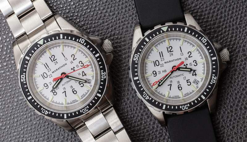 今天,總部位于加拿大的Marathon推出了參考 WW194026-WD(手鐲上的 WW194026-BRACE-MA-WD)北極版中號 Search And Rescue Automatic with Date and Tritium 36MM Arctic(簡稱 MSAR Auto),aBlogtoWatch 有獨家新聞。這是之前Marathon Medium Diver’s Quartz 手表(aBlogtoWatch 動手操作)的基于自動機芯的版本(還有一些其他調(diào)整)。Medium Diver’s Quartz 是 Marathon 的第一款白表盤手表,36 毫米北極 MSAR Auto 是第二款。兩款腕表均采用相同的 36 毫米寬不銹鋼表殼,防水深度達 300 米。