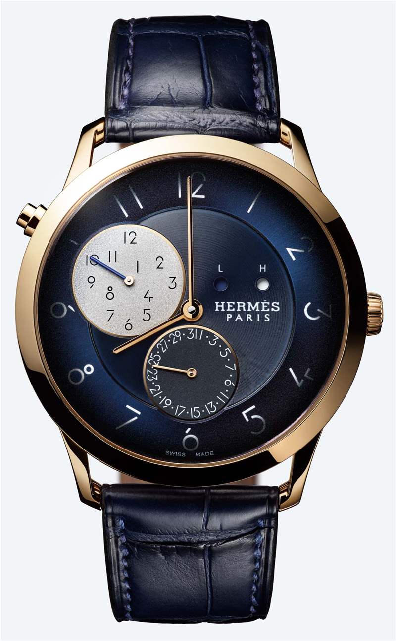 Hermès Slim GMT 手表內部是 H1950 自動微型轉子機芯,由 Vaucher 為 Hermès 生產。在纖薄的自動機芯之上是用于 GMT 復雜功能的 Aghenor 模塊。機芯以 3Hz 頻率運作,動力儲存 42 小時。附在手表上的是一條藍色鱷魚愛馬仕皮革表帶。
