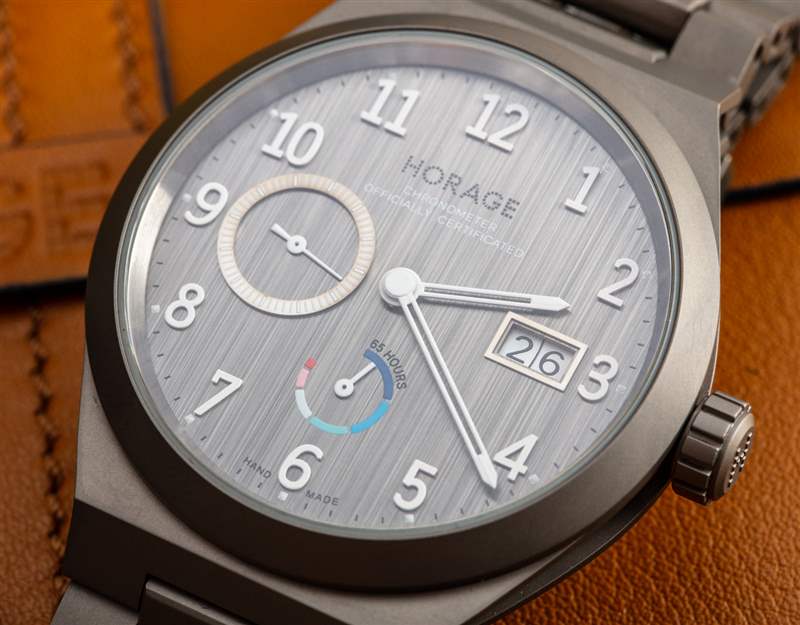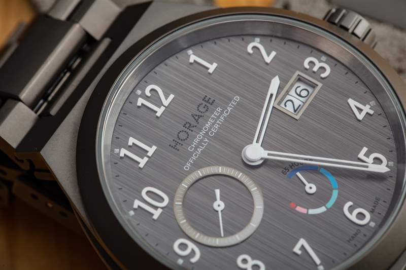 Horage 生產的標準 Autark 模型在某些方面與“10 年限量版”有些不同。表圈完全光滑,而不是被切割成小凹口。鈦金屬表殼經過硬化和噴砂處理,而不是拉絲處理。表盤本身也不同——經過拉絲處理,然后賦予深灰色無煙煤色調,與應用的白色阿拉伯小時數字和相配的白色指針形成鮮明對比。