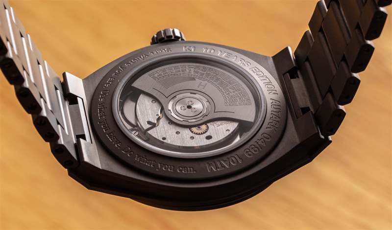 表盤上方是平坦的 AR 涂層藍寶石水晶鏡面,不會產生眩光問題。手表后部的另一個水晶提供了運動的視圖 – 轉子和主橋也進行了無煙煤處理。自動轉子本身有一些非常小的雕刻,應該用 19 種不同的語言寫著“10 年”。這讓我想起了我們經常在一些高珀富斯手表上找到的文字。自動轉子本身是鎢制的。為什么?就重量而言,大多數情況下,鎢比鉑更便宜。轉子越重,手表上鏈的效率就越高。我想報告說,在佩戴 Autark 時,我發現 K1 機芯確實非常有效地上鏈(意思是快速上鏈),我一直關注的彩色動力儲存指示器證明了這一點。