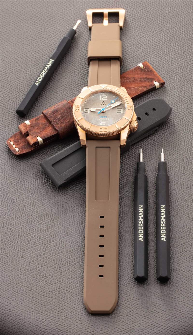 Andersmann Bronze 手表的套件中包含三種表帶選擇以及工具——這是一種受歡迎的感覺。幾年前,安德斯曼的手表有橡膠表帶,我發(fā)現(xiàn)它不會老化。從那以后,該品牌了解到,較新的橡膠表帶更加發(fā)燒級(盡管仍然是基本的)。安德斯曼包括一條與表盤相配的卡其色橡膠表帶,以及一條更標準的黑色橡膠表帶。套件中還包括一條做舊的皮革表帶——但對于運動或潛水任務,橡膠表帶是最好的選擇。