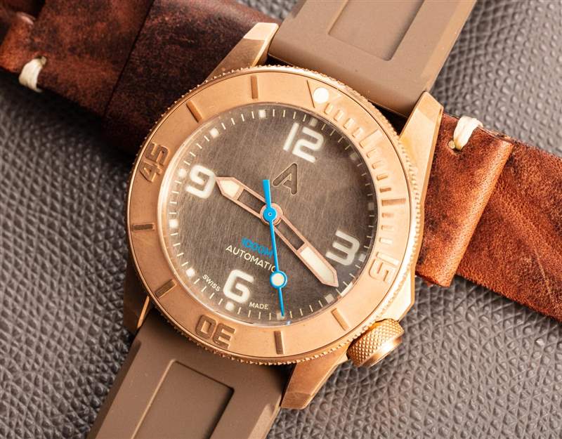 耐腐蝕青銅很有幫助,因為這意味著即使在有鹽的地方(空氣或水中),表殼也不會腐蝕,上面有綠色斑點,也會磨損到皮膚上。在這里你可以看到全新形式的安德斯曼青銅表,但幾年后表殼會變暗——不過,根據(jù)我的經(jīng)驗,這種青銅合金變暗相對均勻,而其他一些青銅表開始出現(xiàn)我認為沒有吸引力的黑色或其他顏色斑點。我更喜歡均勻的銅綠。廣告訊息廣告信息結束