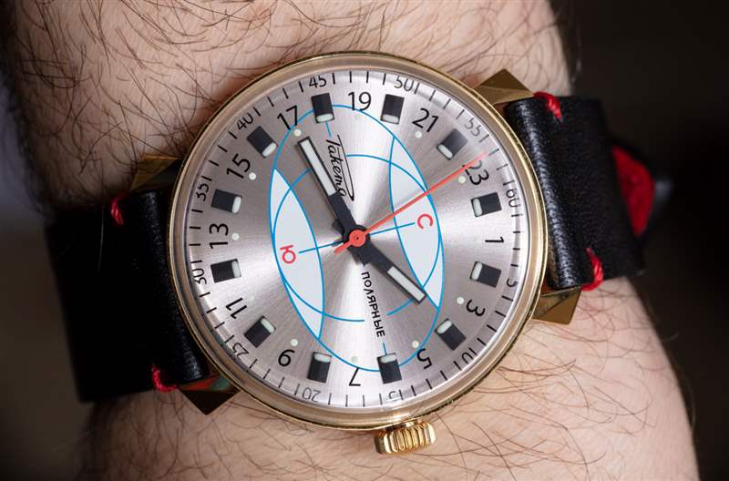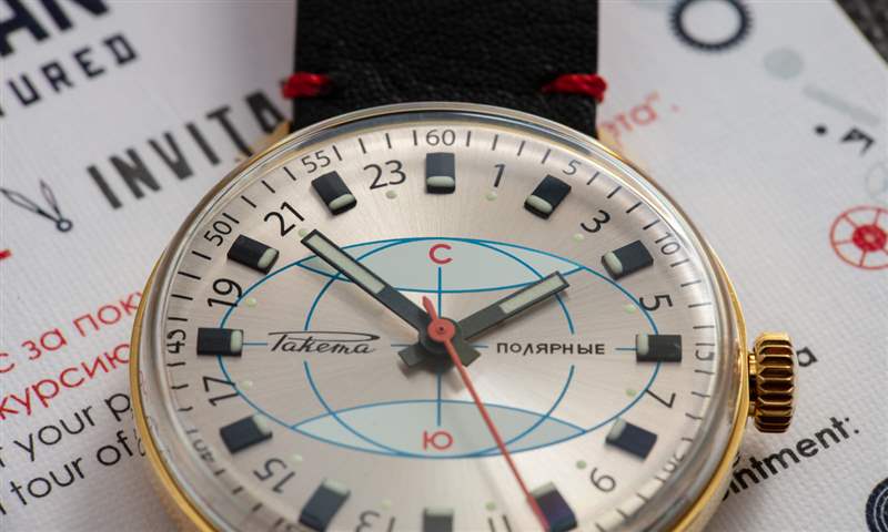 表盤旨在做兩件主要的事情——首先是幫助佩戴者知道時間以及是白天還是黑夜。為了實現這一點,Raketa 設計了一個使用 24 小時標記的表盤,而不是 12 小時標記。相同的機芯后來也被用于各種 Raketa 手表,這些手表適用于各種場合(例如地下),佩戴者在使用 12 小時格式表盤手表時不容易知道是白天還是黑夜)。