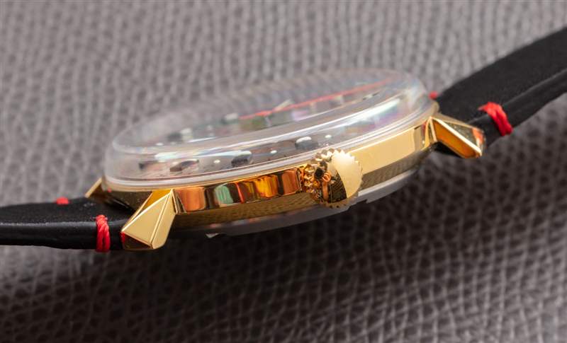 按照現代標準,Raketa Polar 偏小,帶有 35 毫米寬的鋼制表殼。鑒于其近 12 毫米的厚度,表殼不會磨損得太小。它還具有大約 40 毫米的凸耳到凸耳的距離。表殼防水深度為 30 米,表盤上方是盒子式亞克力水晶。在 Raketa 網站上,Polar 的水晶材料僅被描述為“有機”。我不知道這是否只是從俄語到英語的糟糕翻譯,但我從未見過用于指定手表水晶材料的術語。附在表殼上的是一條簡單而舒適的黑色皮革表帶,帶有性感的紅色縫線。