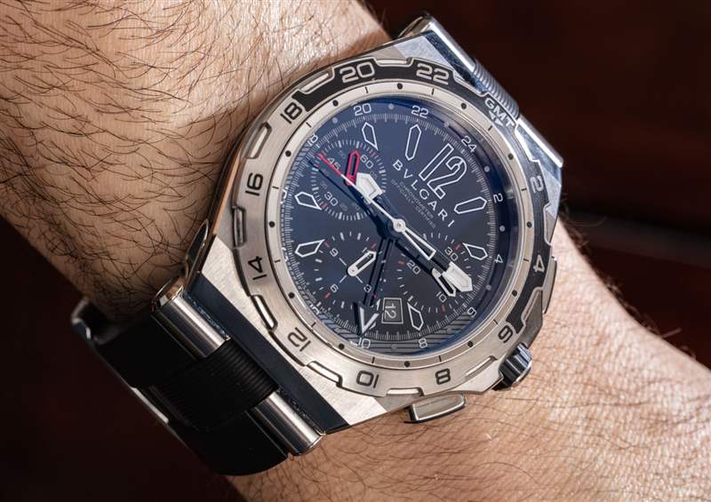 Bulgari 的大多數(shù) Diagono 手表都具有獨(dú)特的表殼設(shè)計(jì)元素,表帶和表殼之間采用門鉸鏈?zhǔn)竭B接。這個關(guān)節(jié)點(diǎn)使佩戴體驗(yàn)更加舒適,在這里表現(xiàn)得非常好。盡管有 45 毫米和大約 19 毫米厚的表殼,Diagono X-Pro 佩戴在帶有鉸接表耳的橡膠表帶上非常舒適和牢固。例如,在這里,您可以閱讀我對 Bulgari Diagono Scuba 手表的 aBlogtoWatch 評論,了解鉸鏈?zhǔn)奖矶M件在 Digaono 系列手表上的正常外觀。帶有鋼制部分的定制橡膠表帶本身和不那么保守的設(shè)計(jì)是一個品味問題,但我碰巧非常喜歡它。廣告訊息廣告信息結(jié)束