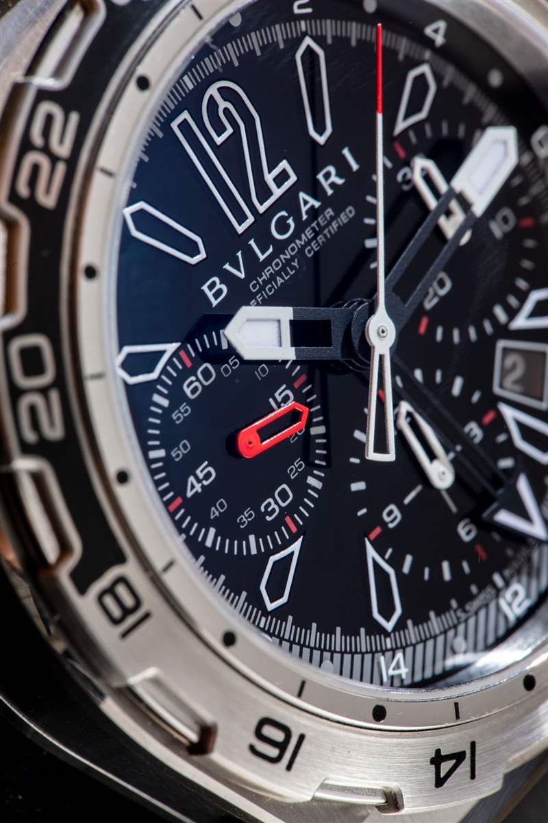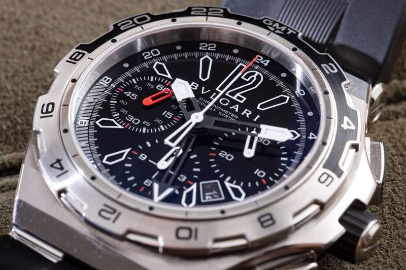 Diagono X-Pro 有一個旋轉(zhuǎn)表圈,需要一個小壓力機(jī)才能旋轉(zhuǎn)。雙向旋轉(zhuǎn)表圈采用印刷鋼制成,并帶有 GMT 指針標(biāo)記。表盤上有另一個用于 GMT 指針的刻度,因此表圈可用于跟蹤第三時區(qū)。Diagono X-Pro 我最喜歡的部分是寶格麗決定使用一塊黑色藍(lán)寶石水晶作為實(shí)際表盤材料。從那以后我就再也沒有見過寶格麗這樣做了,這意味著要實(shí)現(xiàn)它可能是一個技術(shù)難題。然而,在我個人看來,其結(jié)果是有史以來最清晰、最清晰、最整潔的運(yùn)動手表表盤之一。