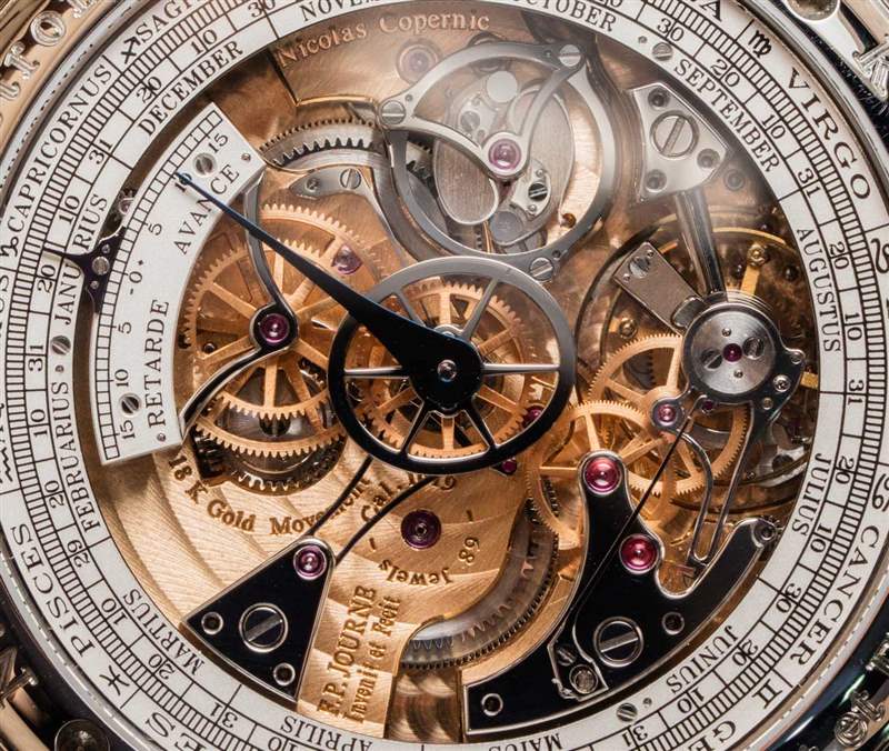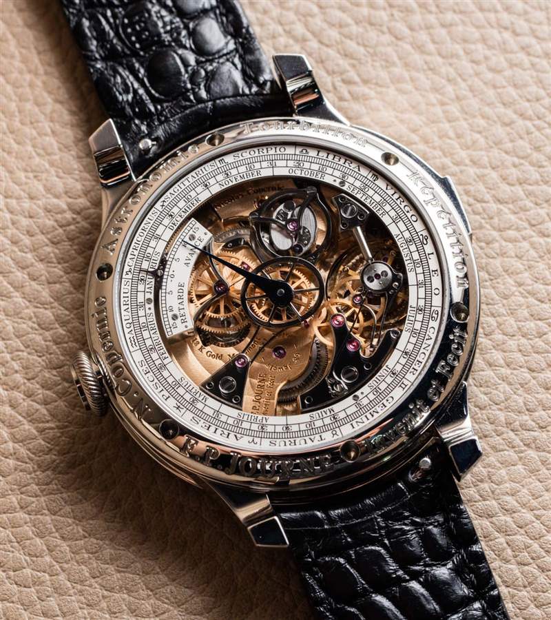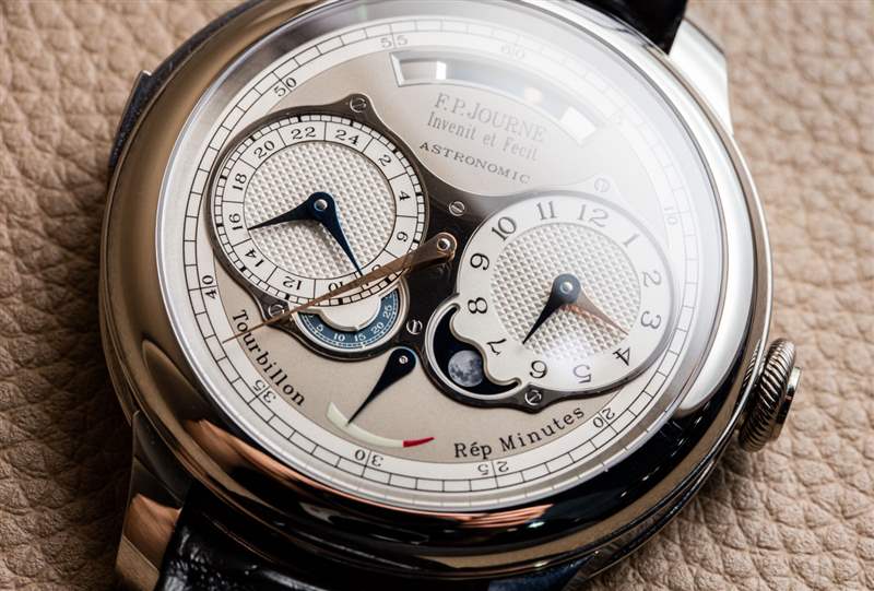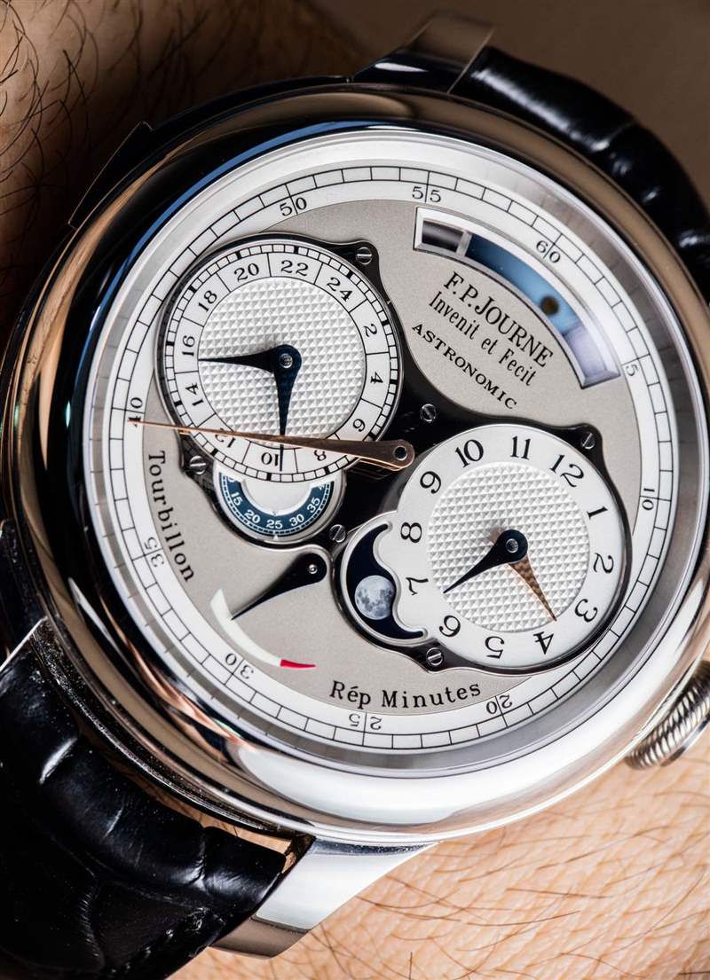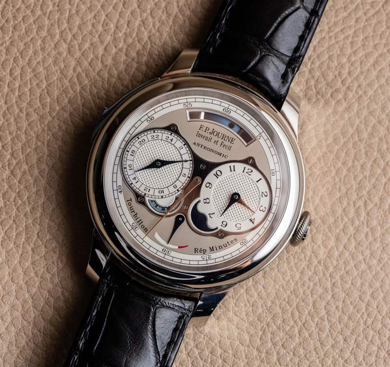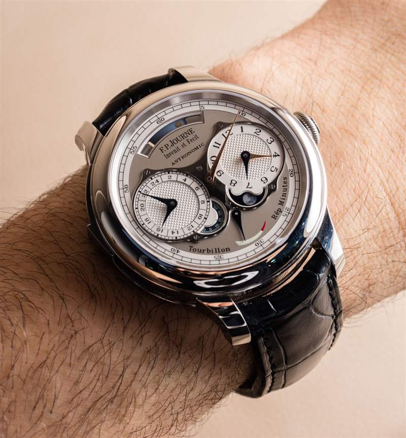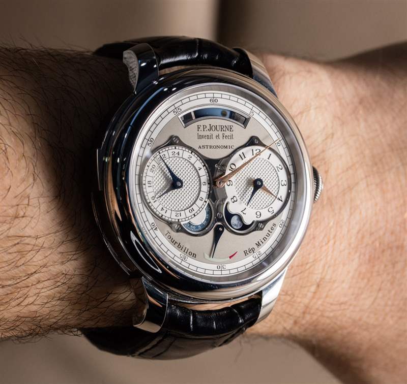 這不是 Journe 先生第一次在報時表中選擇明智的金屬選擇。他曾在FP Journe Sonnerie Souveraine 手表上這樣做(aBlogtoWatch 在這里動手).?加入三問表實際上只是為這款天文表錦上添花,因為它的全部目的是關于天體指示和時間的分鐘重復。同樣值得注意的是,這款手表并不嚴格需要陀飛輪,但它也有一個(通過手表后部可見)。當你是像 FP Journe 這樣的制表師時,麻煩之一是你對收藏家設定了如此高的標準,如果你創造了像 Astronomic Souveraine 時計這樣不包括陀飛輪的東西,就會有很多令人困惑的電子-郵件來回答。因此,為了節省時間和向許多消費者解釋,增加陀飛輪似乎是一個實際的選擇。這也是那些似乎需要印在手表表面上的“陀飛輪”和“重復[重復]分鐘”標簽的粉絲。