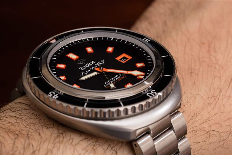 我對這款特別的 Super Sea Wolf 68 Blaze 的欣賞的一個非常重要的部分不僅是表盤設計,還有表鏈。鑒于相對較大的 44 毫米寬表殼和較窄的 20 毫米表耳,Zodiac 發現將表殼與合適的表帶配對具有挑戰性。問題是比例問題。這是繼 Andy Mann ZO9508 之后的第二款 Super Sea Wolf 68 Saturation 腕表,配備全新的三連桿鋼表鏈。手鐲有一個輕微的錐形,與視覺上的錐形表殼相匹配。結果仍然是一個窄手鐲,但感覺更和諧,因為它模仿了表殼的線條流動。這是迄今為止 Super Sea Wolf 68 最好的手鏈,它幫助這款 Super Sea Wolf 68 Saturation 準備好成為時尚達人和工具手表專家的主流手表。廣告訊息廣告信息結束