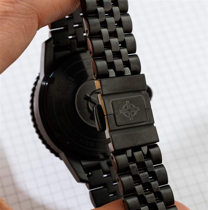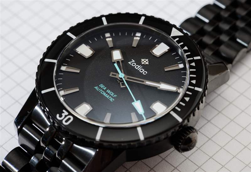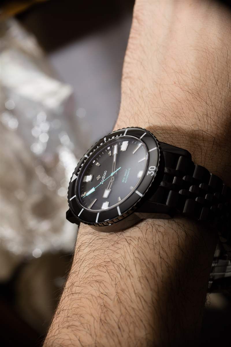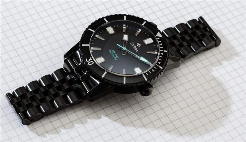 對(duì)比度很有趣,因?yàn)殡m然它可以在幾乎所有情況下幫助易讀性,但太多的對(duì)比度會(huì)導(dǎo)致強(qiáng)烈的對(duì)比色……這會(huì)導(dǎo)致整體優(yōu)雅的侵蝕。在 Super Sea Wolf 53 Black 上特別好用的是黑色 40 毫米寬的表殼和配套的表鏈。至少可以說(shuō),很難找到這樣的黑色手鏈,因?yàn)槭宙湹拿恳粔K都應(yīng)該單獨(dú)涂層。我不確定 Zodiac 使用了什么工藝(因?yàn)檫@款手表的售價(jià)僅比非黑色款高一點(diǎn)),但鋼表鏈上的黑色涂層非常均勻,有助于為這款表鏈設(shè)計(jì)注入新的活力。廣告訊息廣告信息結(jié)束