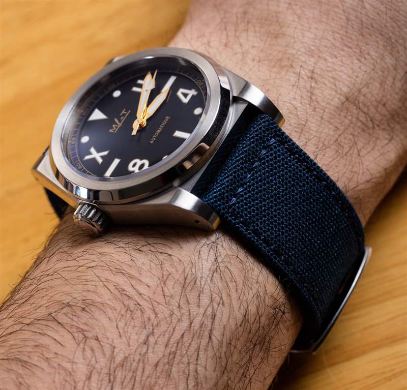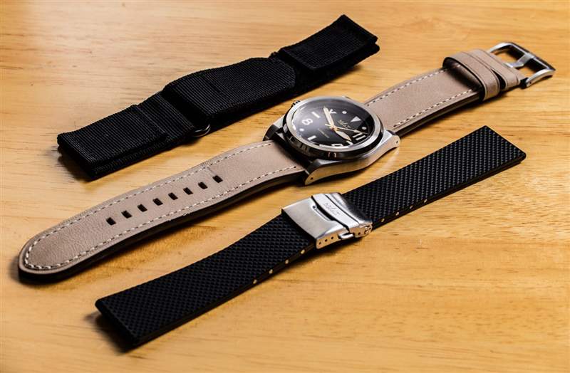 表殼內(nèi)是瑞士 ETA 2824-2 自動(dòng)機(jī)芯,以 4Hz 運(yùn)行,動(dòng)力儲(chǔ)存約兩天。對(duì)于這種風(fēng)格和價(jià)位的手表來(lái)說(shuō),這是一款合適的機(jī)芯。我喜歡表盤缺少日期窗口的方式,因?yàn)檫@有助于保持美觀和表盤對(duì)稱。MAT 的肩帶很慷慨,而且還碰巧提供了一些我最喜歡的第三方肩帶。California XL 手表提供三種表帶選項(xiàng),但實(shí)際上我一直將它佩戴在同樣來(lái)自 MAT 的藍(lán)色紋理表帶上。在風(fēng)格方面,我喜歡 42.5 毫米寬的表殼和 24 毫米寬的表帶的組合,因?yàn)樗兄谶M(jìn)一步體現(xiàn) California XL 手表所追求的大膽“XL”主題。MAT California XL 手表的包裝中包含一條棕褐色皮革表帶、一條黑色橡膠表帶和折疊展開式表扣,以及帶有魔術(shù)貼連接系統(tǒng)的古怪黑色紋理表帶。后一種表帶是手表的有趣但小眾選擇,在隨附的表帶中,棕褐色皮革表帶很容易成為我的最愛。