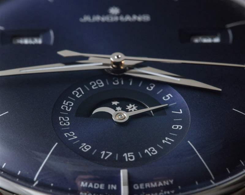 作為一款日歷手表,Meister Calendar 提供月份、星期幾、日期和月相指示器。我認為機芯是一個完整的日歷,在奇數月需要調整日歷方面,它有點低于年歷。要調整日歷設置,只需使用位于表殼兩側的小嵌入推桿。我真正喜歡的是信息的傳統對稱布局,以及窗口的使用(與所有表盤相反)。表盤用于日期指示器,其中有一個用于月相指示器的窗口。請注意,Junghans 為手表提供英文或德文的日歷信息。