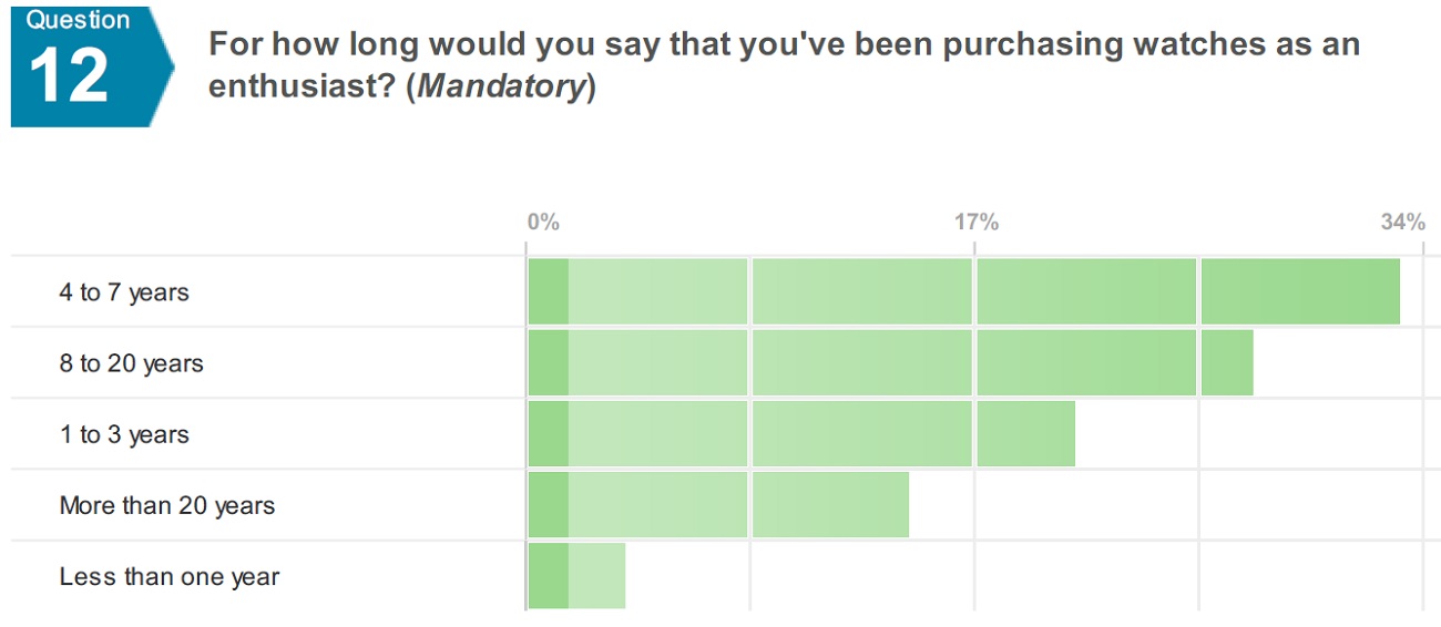 我發(fā)現(xiàn) aBlogtoWatch 非常有趣的一點是,它已經(jīng)發(fā)展成為成熟收藏家的平臺。只有25%的觀眾收藏不到三年,只有4%的人收藏不到一年。因此,98% 的人擁有超過 2 塊手表,59% 的人擁有 5 到 30 塊手表也就不足為奇了。據(jù)報道,有 2% 的人擁有 100 多塊手表。廣告訊息廣告信息結(jié)束