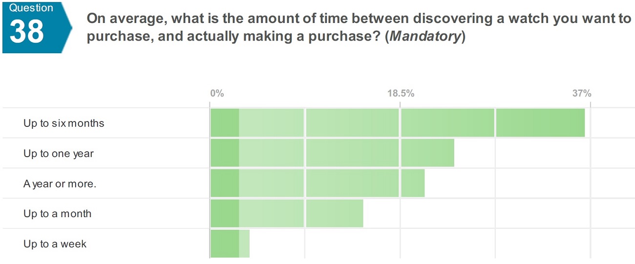 您還花費大量時間閱讀手表和查看評論。72% 的人每天觀看媒體,而 96% 的人至少每周向互聯(lián)網(wǎng)鐘表之神祈禱。幾乎沒有人在不做大量研究的情況下購買手表,而且考慮購買也需要時間。大多數(shù)手表愛好者需要 6-12 個月 (63%) 在您第一次對手表感興趣后做出購買手表的決定。46% 的人似乎更喜歡已經(jīng)存在了一段時間的手表品牌,44% 的人對歷史悠久的和新成立的手表品牌同樣感興趣。