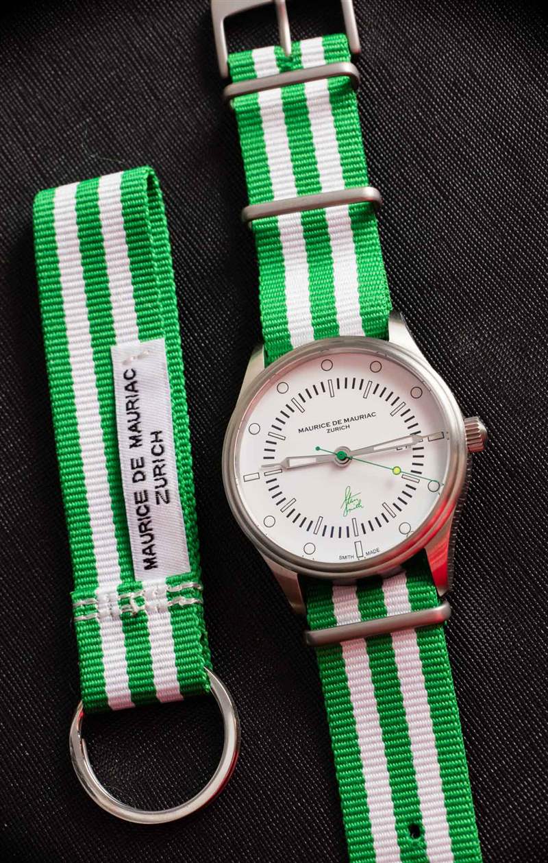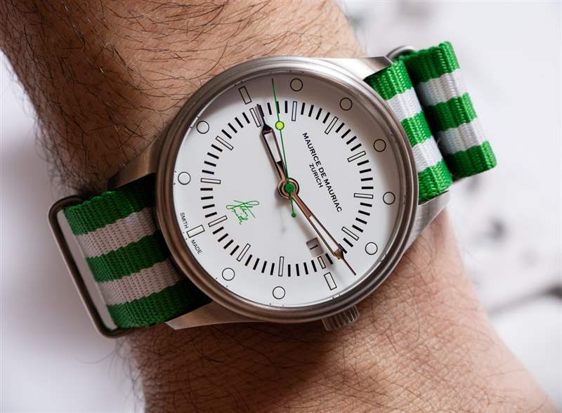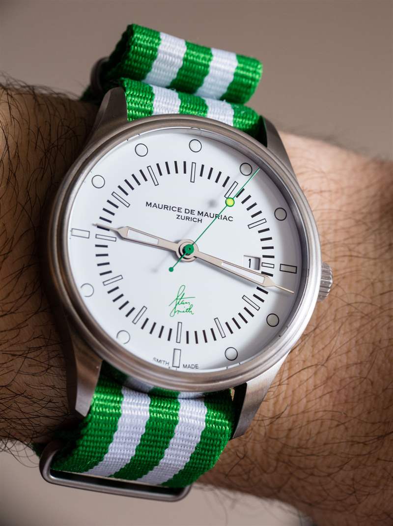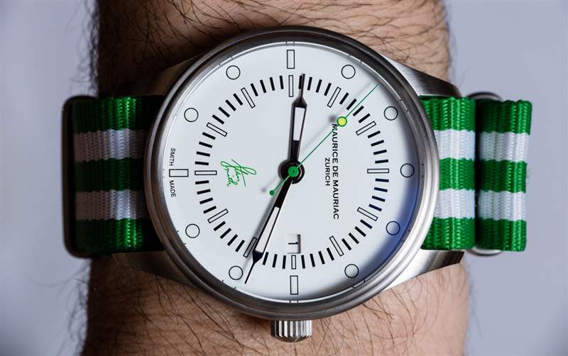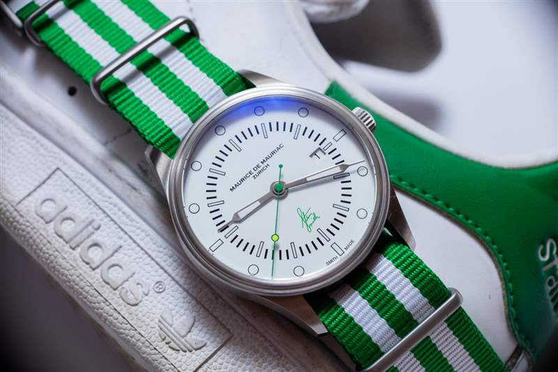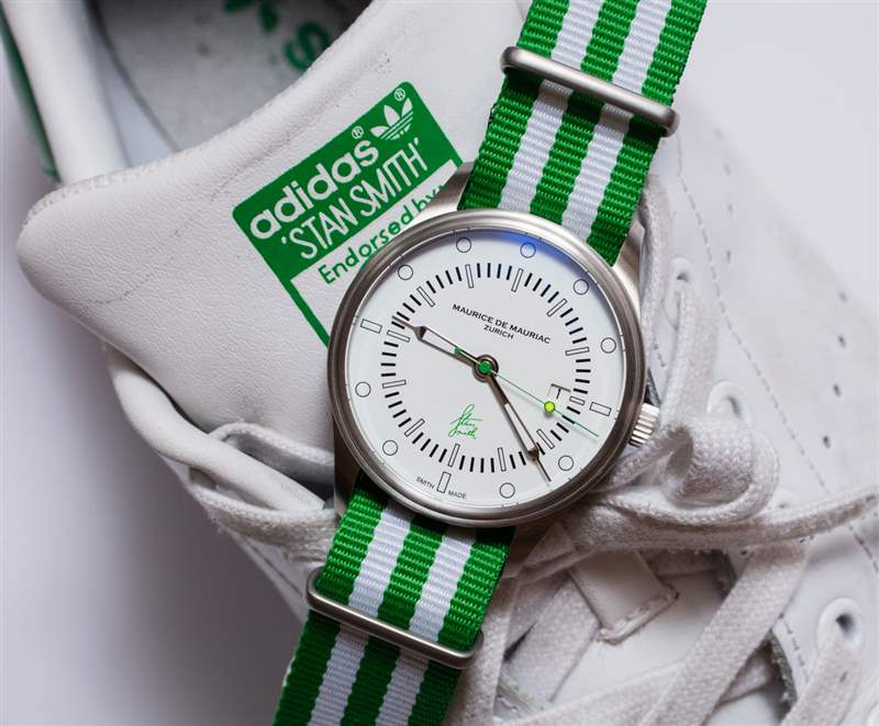 Maurice de Mauriac?Stan Smith Signature 手表是對(duì)這個(gè)蘇黎世品牌所享受的消遣的頌歌(嗯,至少其中一個(gè))。自從我認(rèn)識(shí) Daniel Dreifuss(Maurice de Mauriac 的創(chuàng)始人)以來,他就喜歡網(wǎng)球和運(yùn)動(dòng)鞋。在這款腕表中,他既慶祝了這兩者,也慶祝了時(shí)尚偶像。就在兩天前,我在一次會(huì)議上注意到一位紳士穿著由阿迪達(dá)斯生產(chǎn)的標(biāo)志性的、大部分為白色、帶有綠色飾邊的網(wǎng)球鞋,鞋舌上有 Stan Smith 的臉。